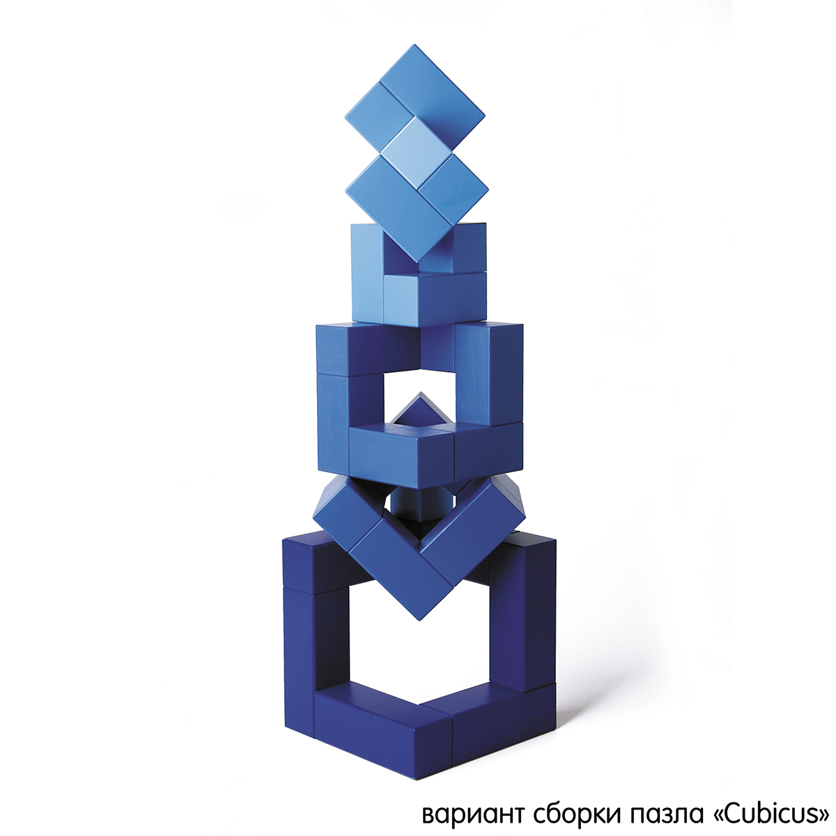Конструктор Cubicus в сложенном виде представляет куб размером 10 х 10 х 10 см. По принципу матрёшки в этот куб вложены геометрические детали, с помощью которых можно создать бесконечное количество вариантов конструкций. Детали точно прилегают друг к другу, что позволяет создавать сложные композиции. Конструктор Cubicus выполнен из натурального дерева (клёна), детали имеют цвета синих оттенков - от тёмного-синего до голубого, все детали качественно и гладко обработаны. Всего 10 деталей. Подходит для детей от 6 лет.