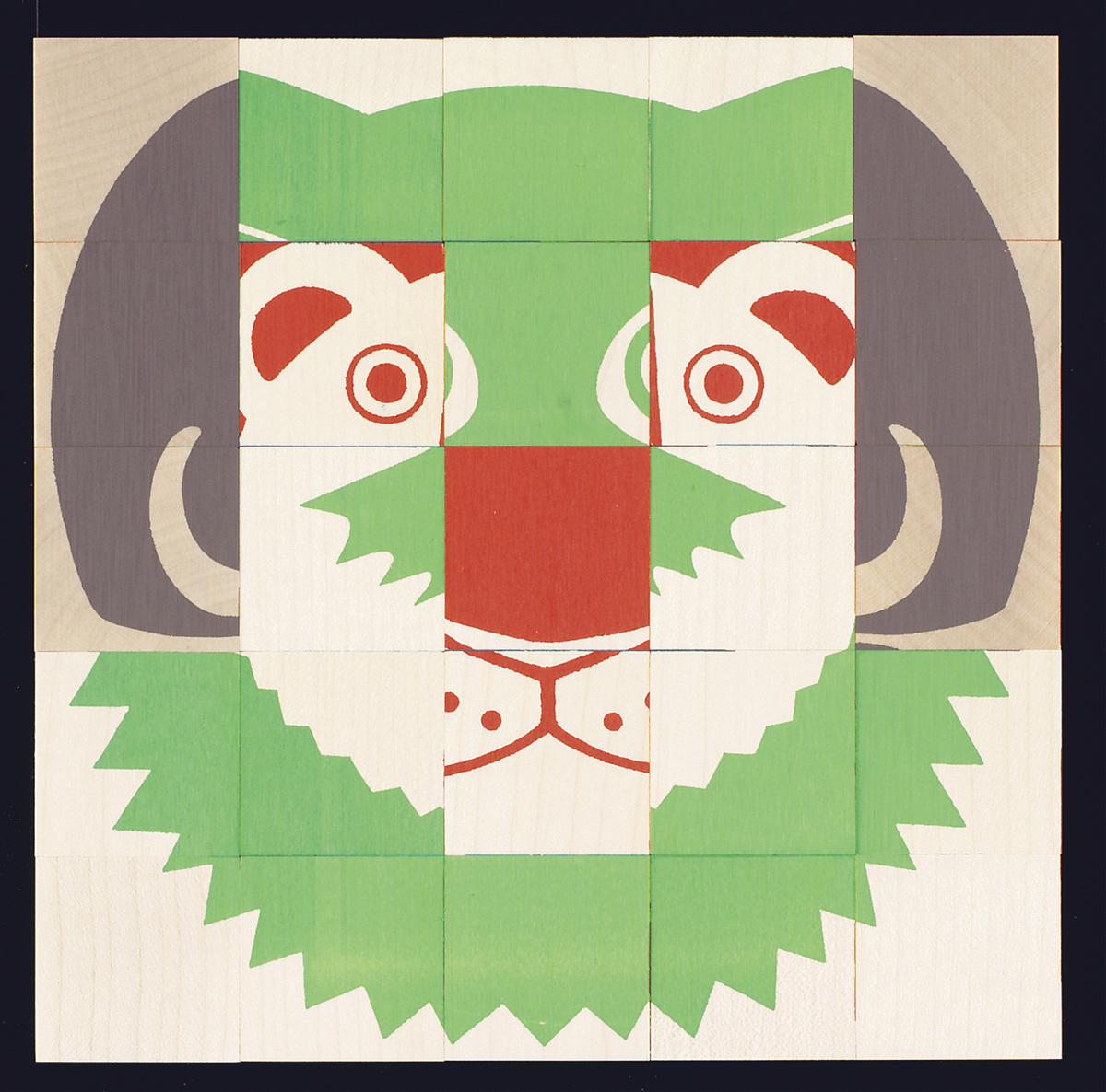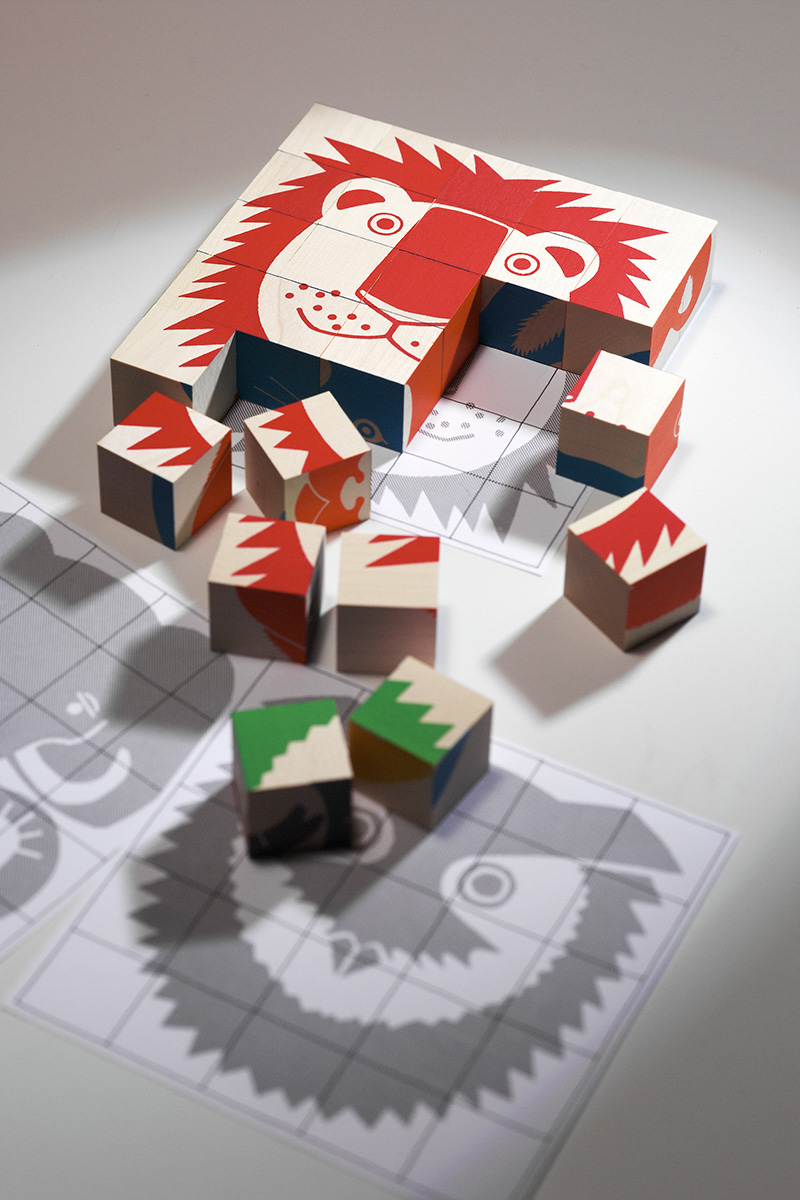 Мозаика ""Animal Puzzle"" - это 25 разноцветных деревянных кубиков со сторонами 3,5 см, из которых можно ""собрать"" разных животных. Это может быть слон или обезьяна, лев или сова, заяц или медведь, а также и забавные воображаемые животные, такие как «лев-сова» или «слон-медведь». В качестве руководства к мозаике прилагаются описания шести основных вариантов. Достаточно большие кубики дают возможность играть детям, начиная с 3-х лет. Дизайнер ""Animal Puzzle"" - Аой Хубер Коно.
