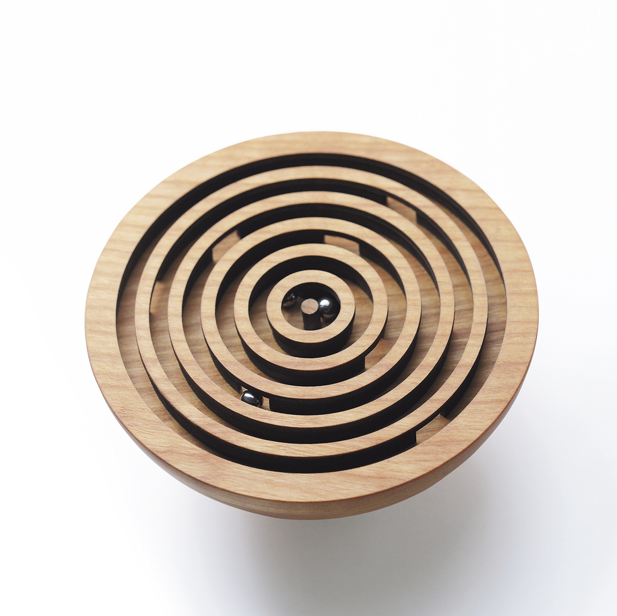 Красиво и стильно упакованная, любая деревянная игрушка Naef может служить превосходным и необычным подарком. Головоломка-лабиринт Sphaera - это красивая полусфера диаметром 12,5 см, изготовленная из натурального дерева (вишни). На поверхности этой полусферы - концентрический лабиринт с 2-мя шариками. Маленькие стальные шарики нужно пропустить через пять колец в центр. Кажется, что это можно сделать быстро, но достижение цели требует ловкости и терпения, поскольку пути между кольцами не видны с первого взгляда. Игра медитативного характера. Корпус головоломки приятно долго держать в руках, он достачно лёгкий - всего 150 г, дерево обработано идеально гладко и прятно на ощупь. Дизайнеры Sphaera: Сара Ахарт и Брайанна Деринг.