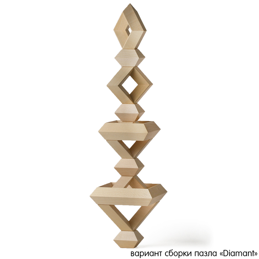 Пазл "Diamant" – настоящий «бриллиант» среди игровых предметов. Это восьмиугольник синего цвета и его оттенков, выполненный из натурального дерева (клёна), который можно разобрать на пятнадцать разных частей, отдельные части которого идеально подходят друг к другу, постоянно образуя новые вариации и увлекательные конструкции. Игровой пазл «Diamant» кристаллографически основан на форме кристаллов алмаза, варианты его можно увидеть в пирамидах, пагодах или крышах почти по всему миру. Устойчивые вариации с архитектурной точки зрения очень приятны игроку. При контрастном освещении можно поиграть с оттенками синего. Стильные оттенки синего цвета — это визуальный праздник для тех, кто обладает эстетическим взглядом. Игра, которая понравится любой возрастной группе, является такой же разнообразной, как огранка самого драгоценного камня. Эта синергия творческой гениальности, красивого дерева и точности ручной работы уникальны. Пазл "Diamant" будет интересен всем, начиная с 6+.
