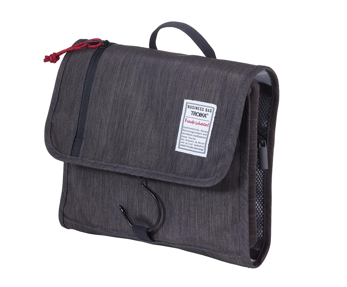 Дорожная сумка для туалетных принадлежностей с крючками для подвешивания и в качестве застежки, внутри: дышащее сетчатое отделение с карманами на молнии и прорезями, 2 отделения на молнии с сеткой и покрытием из ПВХ (защита от жидкостей), передний карман на молнии, полиэстер, антрацит / черный