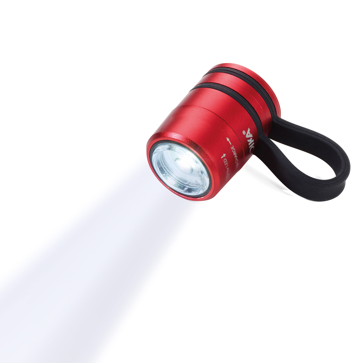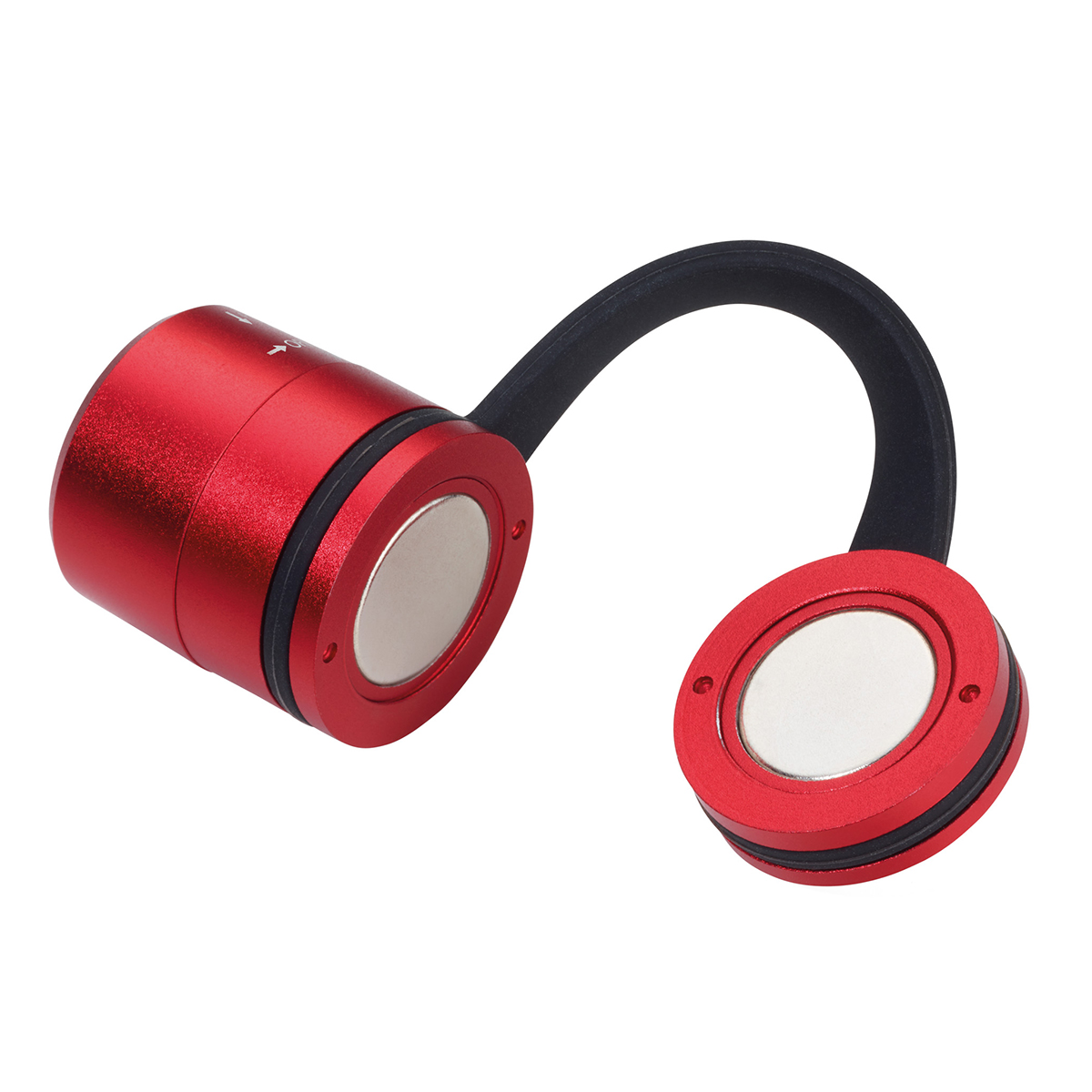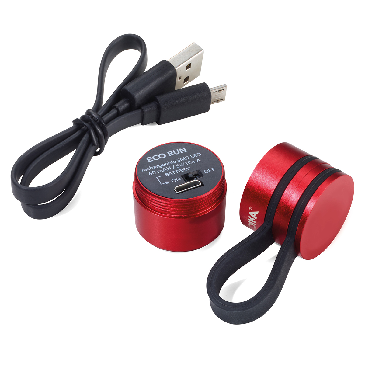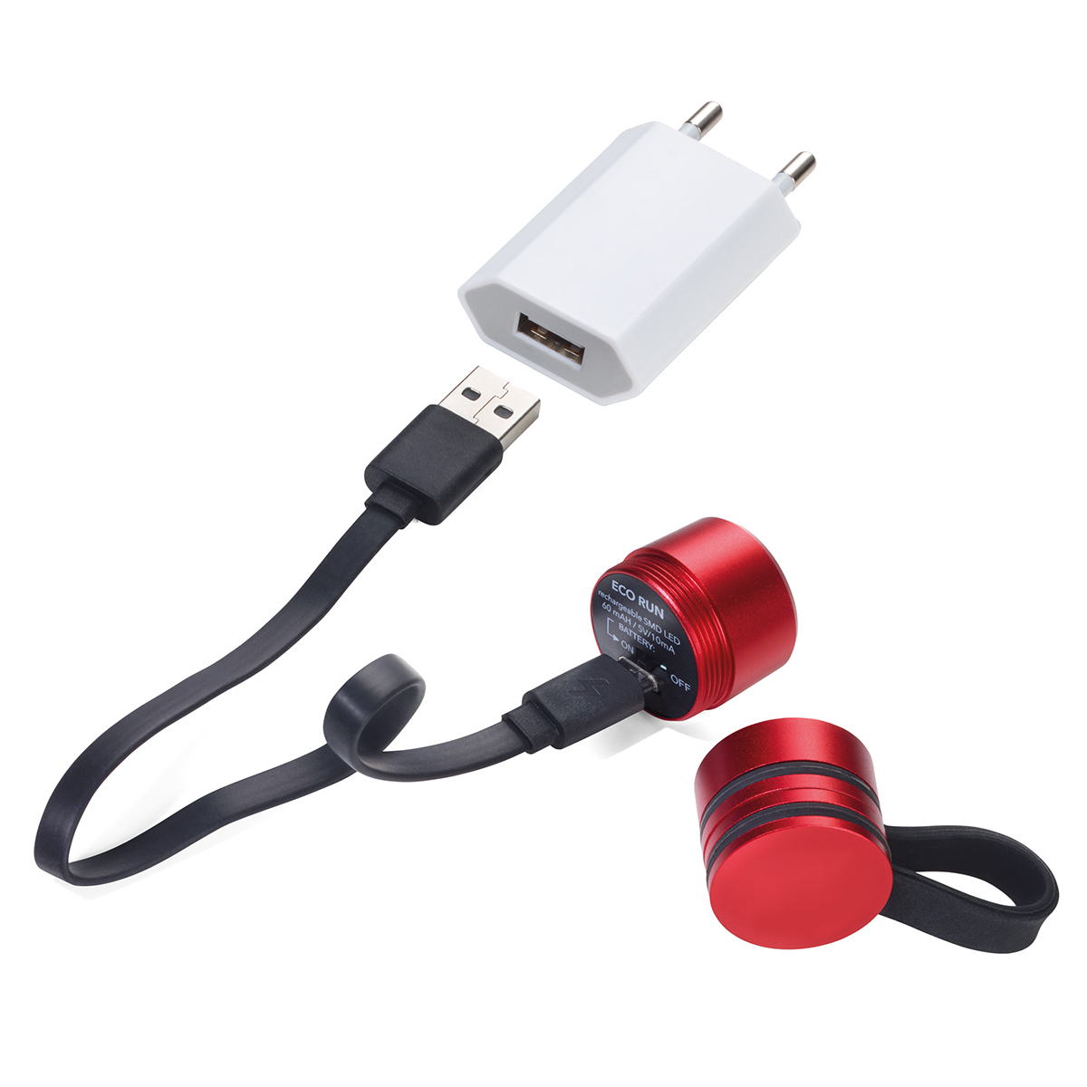 Фонарик, спортивный и аварийный свет, с сильным магнитом для крепления, белый светодиод, 3 функции освещения: 2 силы освещения, мигающие огни, перезарядка через USB (3,7 В - 0,22 Вт), поэтому экологически чистый, литий-полимерный аккумулятор 60 мАч, защита от перезарядки / глубокой разрядки, зарядный кабель в комплекте, алюминий, силикон, матовый, черный / красный