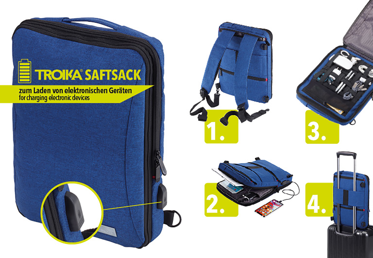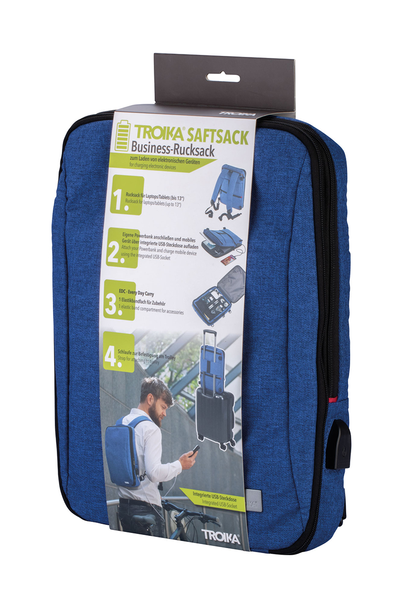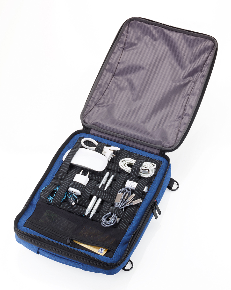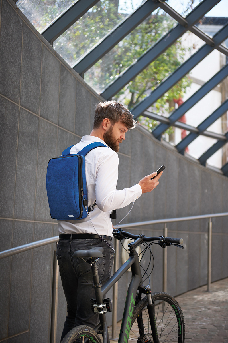 Деловой рюкзак для зарядки электронных устройств, 1 отделение для документов, ноутбука, планшета (до 13 дюймов), 1 отделение на резинке для аксессуаров (повседневная переноска), 1 отделение на спине, складное, мягкие плечевые ремни, эластичная петля для крепление к тележке, встроенный USB-кабель, вход + выход, полиэстер, синий