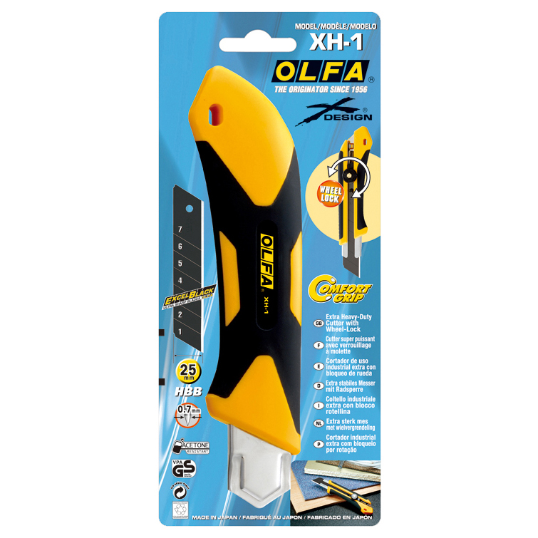 Нож сверхпрочный Olfa. Рукоятка Sure grip изготовлена из эластомера и полипропилена, армированного стекловолокном, для защиты от кислоты и ацетона (масла). Оснащенный прочным лезвием толщиной 0,7 мм и 25 мм, XH-1 обеспечивает острый срез даже при выполнении чрезвычайно сложных задач. Он также подходит для резки более толстых материалов, для которых может не подойти лезвие диаметром 18 мм. Лезвие Excel Black имеет более острый угол заточки, чем наше стандартное серебряное лезвие, и отличается превосходной начальной остротой. Двухступенчатая шлифовка делает его устойчивым к сколам, даже несмотря на то, что он имеет острый угол. Благодаря общей длине 185,0 мм, ширине 49,5 мм и толщине 27,0 мм XH-1 делает его отличным выбором для людей с более крупными руками. Рукоятка X-design разработана таким образом, чтобы помогать прикладывать усилие без скольжения. Полимерная часть изготовлена из полипропилена, армированного стекловолокном, для превосходной прочности. Система фиксации с храповым механизмом обеспечивает неограниченное положение лезвия. Применяется для резки гипсокартона, ковровых покрытий, кожи, резины, фанеры и др.