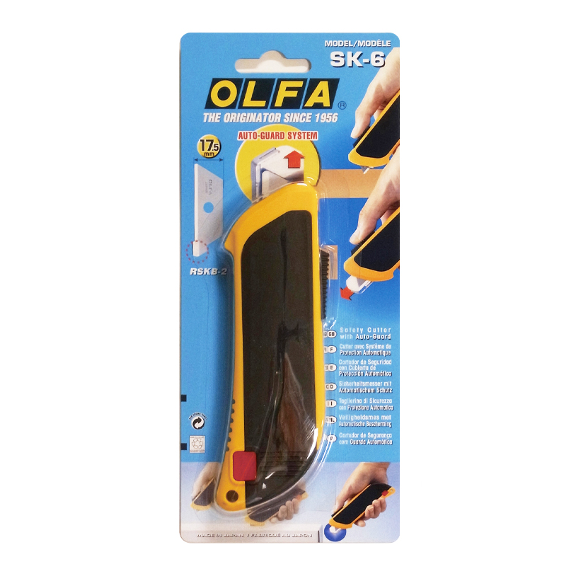 Нож универсальный с выдвижным лезвием и возвратной пружиной Olfa. Лучший безопасный нож с системой автоматической защиты и лезвием с закругленным концом, что помогает снизить количество несчастных случаев. Подходит как для правшей, так и для левшей. Для замены лезвия не требуются инструменты. SK-6 обеспечивает дополнительный уровень безопасности благодаря защитному кожуху, который автоматически выдвигается вокруг лезвия при начале резки. Когда лезвие покидает режущую поверхность, лезвие закрывается защитным кожухом, защищающим пользователя от контакта с лезвием и травм.