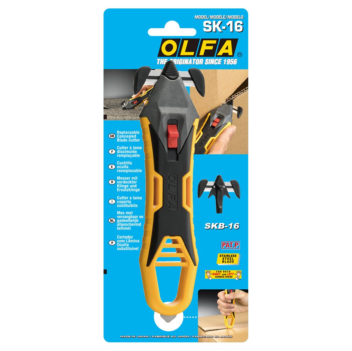 Нож безопасный для вскрытия коробок Olfa. Защитный резак SK-16 со сменным скрытым лезвием был разработан специально для профессионалов, которым требуется частая замена лезвий. SK-16 имеет более широкое отверстие, чем наш SK-15, что позволяет резать более толстые материалы, такие как картонные коробки с двойными стенками, ковровые покрытия и резиновые листы. Минимальная стойкость к порезам благодаря нашему уникальному дизайну. Имея при себе один SK-16, можно выполнить широкий спектр задач по распаковке! Лезвие SKB-16 из нержавеющей стали может разрезать толстые материалы, такие как ковровые покрытия, резиновые листы, картонные коробки с двойными стенками, стрейч-пленку и обвязочные ленты, удовлетворяя потребности тяжелых пользователей.