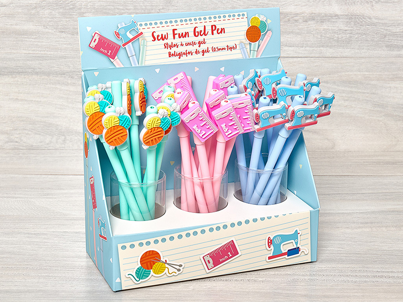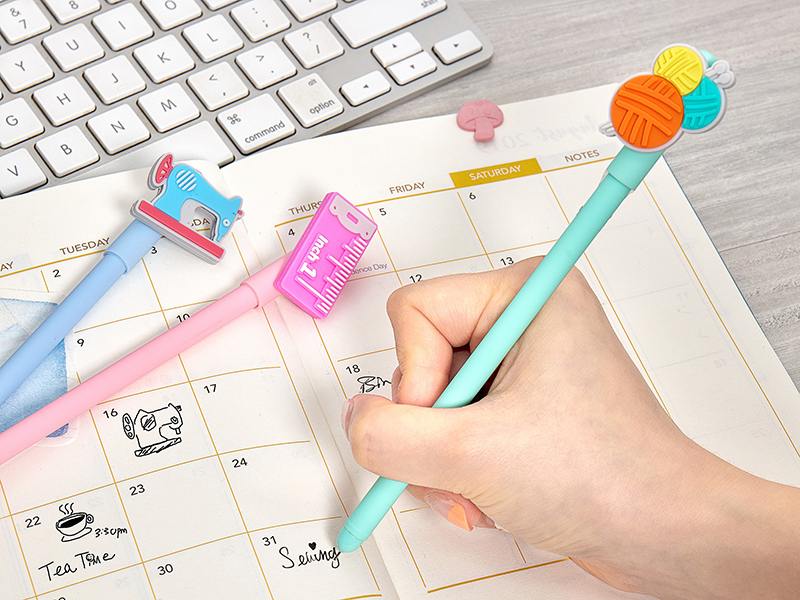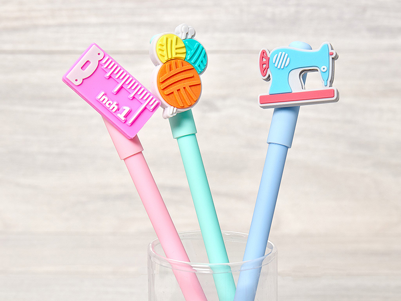 Гелевые ручки с тематическим оформлением в дизайнах: швейная машинка, пряжа, рулетка.