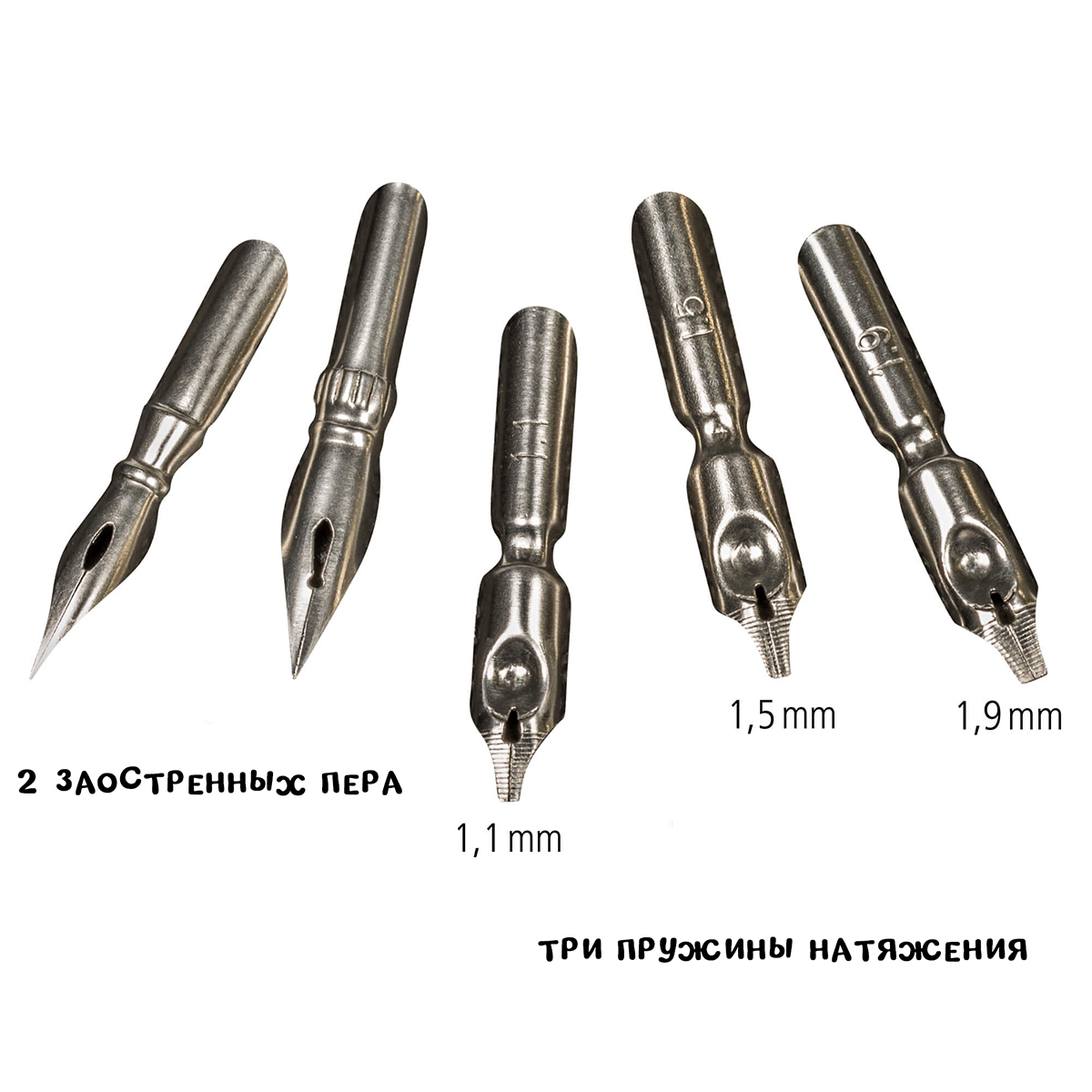 Ручка пера выточена из настоящего дерева. Набор содержит пяти различных перьев: 1,1 мм, 1,5 мм, 1,9 мм и два заостренных пера. чернильницы с качественными коричневыми чернилами, 15 мл.