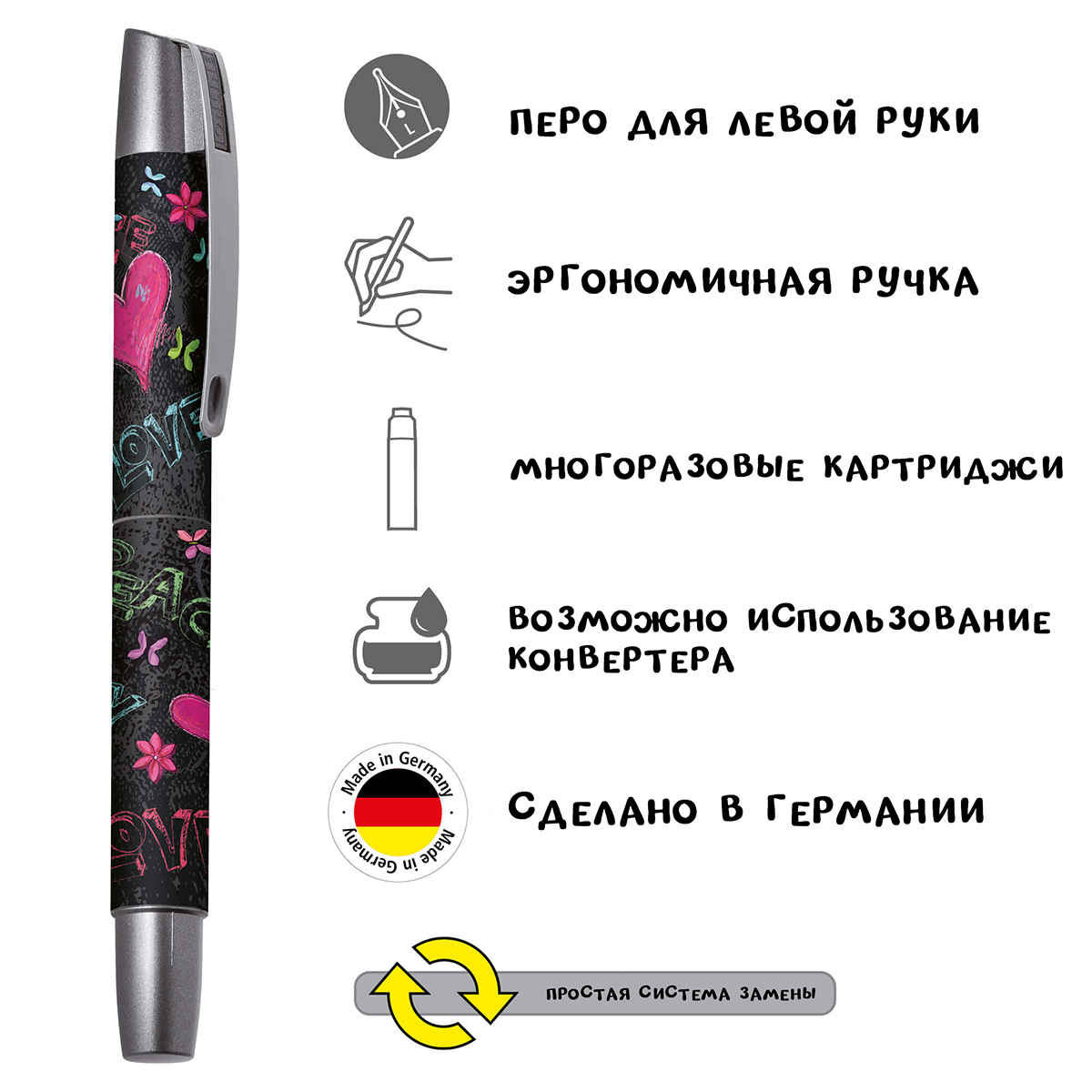 College Lefty — дизайнерская перьевая ручка для левшей. Ее точная отделка и множество модных дизайнов сделали его культовым среди молодежи. Поскольку левша при письме перьевой ручкой не тянут бумагу, а скользят по ней, было разработано специально заточенное перо для левшей, которое обеспечивает удобное и плавное письмо.
