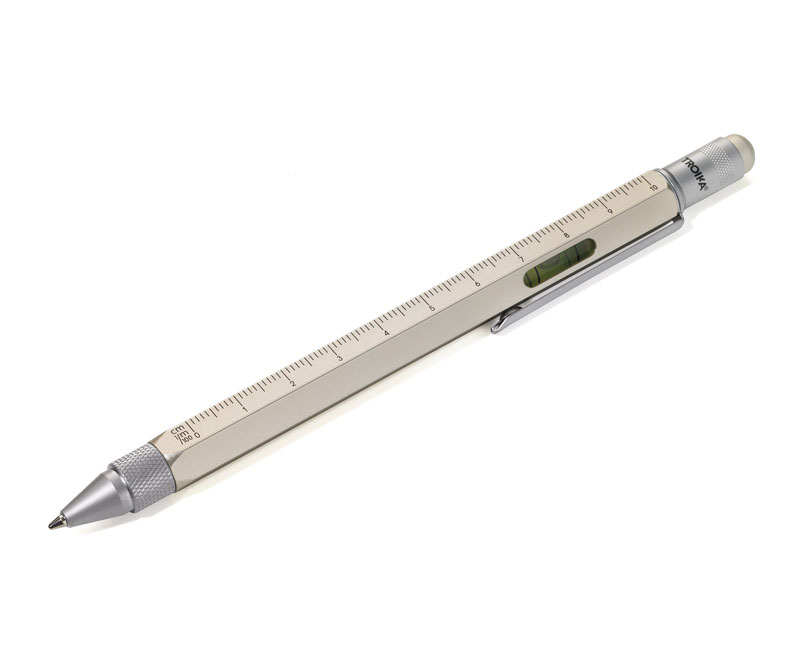 Черный стержень. Фирменная ручка TROIKA CONSTRUCTION является визитной карточкой производителя. Настоящий мужской аксессуар: дюймовая и сантиметровая линейки, крестовая и плоская отвертки, стилус для техники с touch-screen дисплеем, уровень.