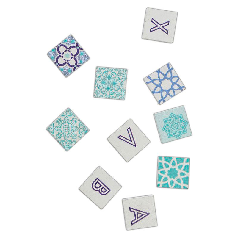 В наборе 50 деревянных квадратиков с буквами и марокканскими мотивами. Размер каждого 2х2 см.
