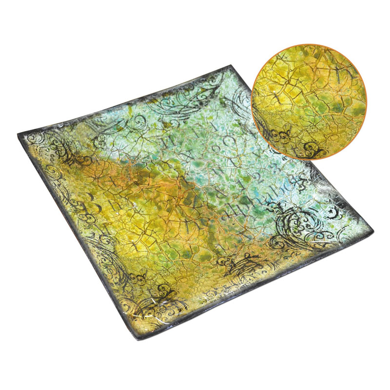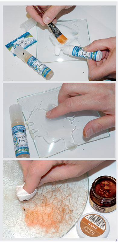 2. Плоской кистью нанесите Шаг 2. Главное, наносить Шаг 2 плотным, равномерным слоем, полностью покрывающим Шаг 1. В зависимости от уровня влажности в помещении трещины начнут появляться через 1 – 2 часа. При сушке феном – через 20 минут. Однако если вам нужны трещины покрупнее, не используйте фен. Пусть заготовка сохнет самостоятельно подальше от батарей и солнца. Дождитесь полного высыхания (1 сутки), затем затирайте трещины, используя Porporina (пурпурин, металлизированную пудру) или Patina Anticante (патинирующая паста) с помощью маленького поролонового спонжа. Не используйте лак-кракле поверх воска. Финишный лак может быть на любой основе: водный, спиртовой. Рекомендуется использовать финишный лак на спиртовой основе (арт.KES04, 05, KE17M, G). При нанесении на декорированную поверхность 5-6 слоев спиртового лака, изделие можно мыть в посудомоечной машине в деликатном режиме. Если кракле Vetro используется при обратном декупаже, покройте его парой слоев лака, а потом продолжайте декор. Кисти после лака-кракле промойте водой с мылом, после спиртового финишного лака кисти надо промывать растворителем (K3P16SOLV, также удаляет лишнюю патину Patina Anticante).