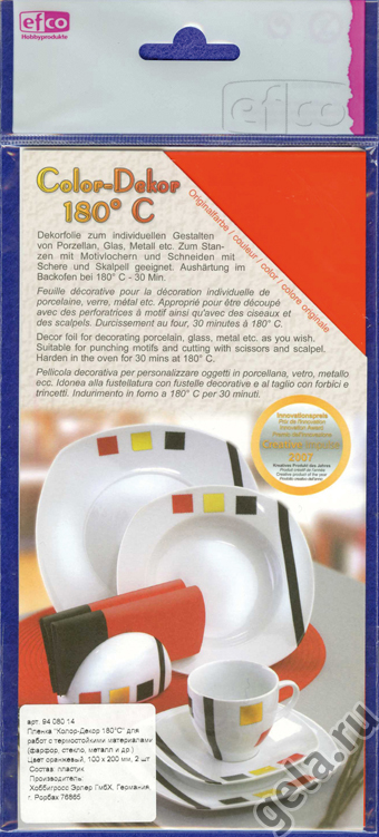 Инструкция: Вырезать нужную форму можно дыроколом, резаком или ножницами, затем положить вырезанный мотив ненадолго в воду. Поверхность на которой будет использоваться Color-Dekor 180° должна быть чистой и обезжиренной. Мотив аккуратно переместить на желаемый объект и разгладить пальцами от середины к краям, чтобы не было пузырьков. Остатки влаги впитать сухой салфеткой. Объект оставить сохнуть на 24 часа. Запомните: перед использованием духовку не нужно нагревать! Положите объект в неразогретую духовку и оставьте на 30 минут при температуре 180° C в режиме верхнего и нижнего нагрева. По истечении 30 минут выключите духовку и оставьте объект охлаждаться в духовке. Готовый объект мыть на руках, не предназначено для мытья в посудомоечной машин. Также можно комбинировать несколько мотивов. Если мотивы нужно клеить друг на друга, то нужно подождать, пока нижний (по слою) мотив хорошо высохнет, прежде чем клеить на него другой мотив. Протереть сухой салфеткой,