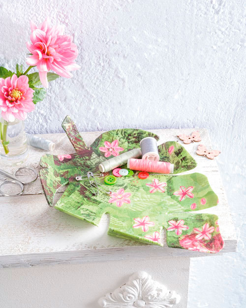 При нагревании феном становится гибкой и сохраняет форму после охлаждения. Готовая форма может быть изменена путем повторного нагрева. Корректировать форму можно при помощи ножниц, а ненужные части могут быть повторно использованы. Иногда слой материала получается слишком тонким, в этом случае необходимо наслаивать толщину друг на друга или среднюю часть заменить фоамираном (вспененной резиной). Для создания формы используйте любую термостойкую поверхность – банки, край стола, трубы и т.д. Задекорировать можно красками и другими украшениями.