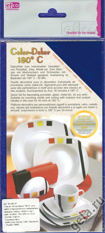 Инструкция: Вырезать нужную форму можно дыроколом, резаком или ножницами, затем положить вырезанный мотив ненадолго в воду. Поверхность на которой будет использоваться Color-Dekor 180° должна быть чистой и обезжиренной. Мотив аккуратно переместить на желаемый объект и разгладить пальцами от середины к краям, чтобы не было пузырьков. Остатки влаги впитать сухой салфеткой. Объект оставить сохнуть на 24 часа. Запомните: перед использованием духовку не нужно нагревать! Положите объект в неразогретую духовку и оставьте на 30 минут при температуре 180° C в режиме верхнего и нижнего нагрева. По истечении 30 минут выключите духовку и оставьте объект охлаждаться в духовке. Готовый объект мыть на руках, не предназначено для мытья в посудомоечной машин. Также можно комбинировать несколько мотивов. Если мотивы нужно клеить друг на друга, то нужно подождать, пока нижний (по слою) мотив хорошо высохнет, прежде чем клеить на него другой мотив. Протереть сухой салфеткой,