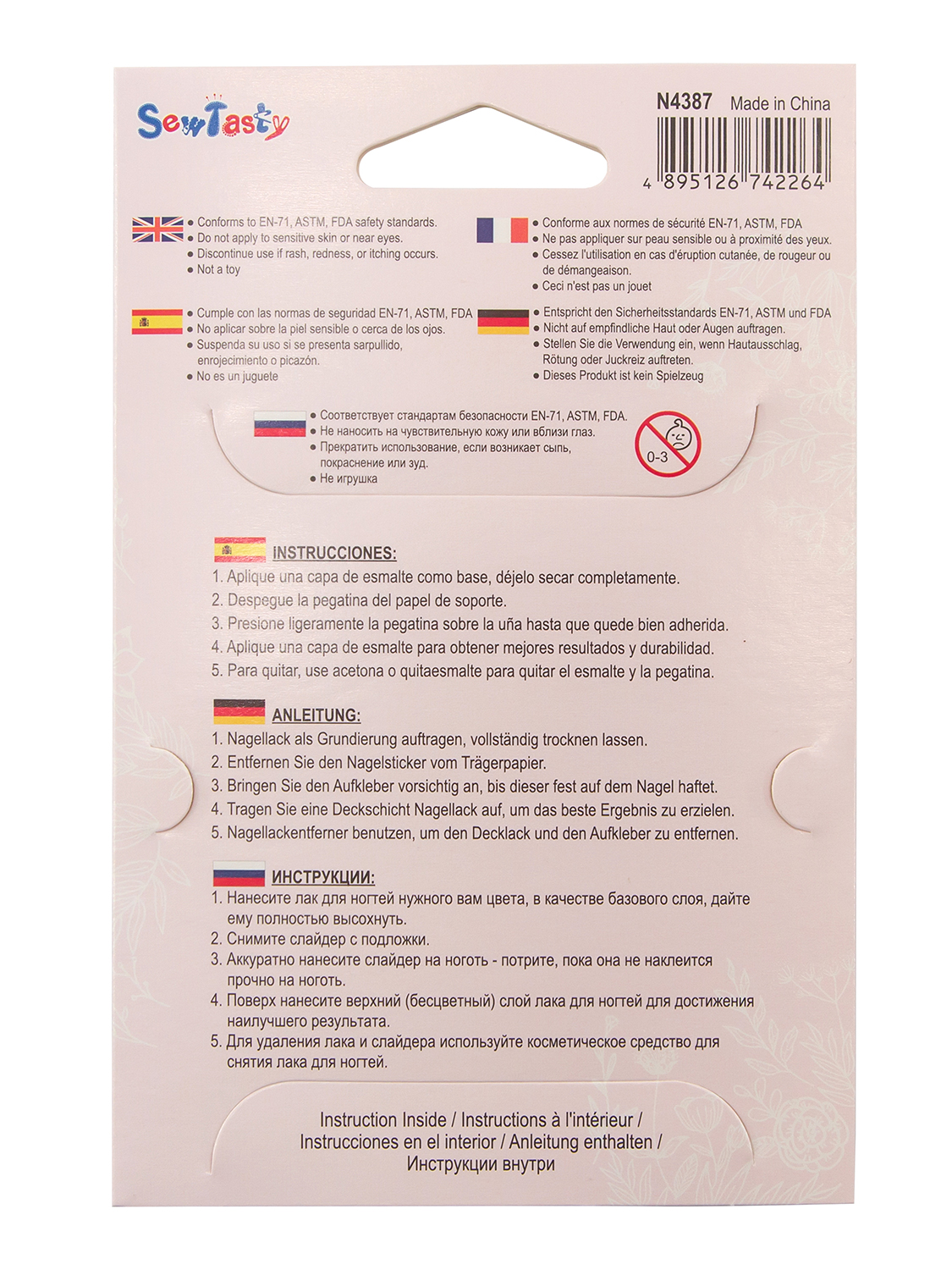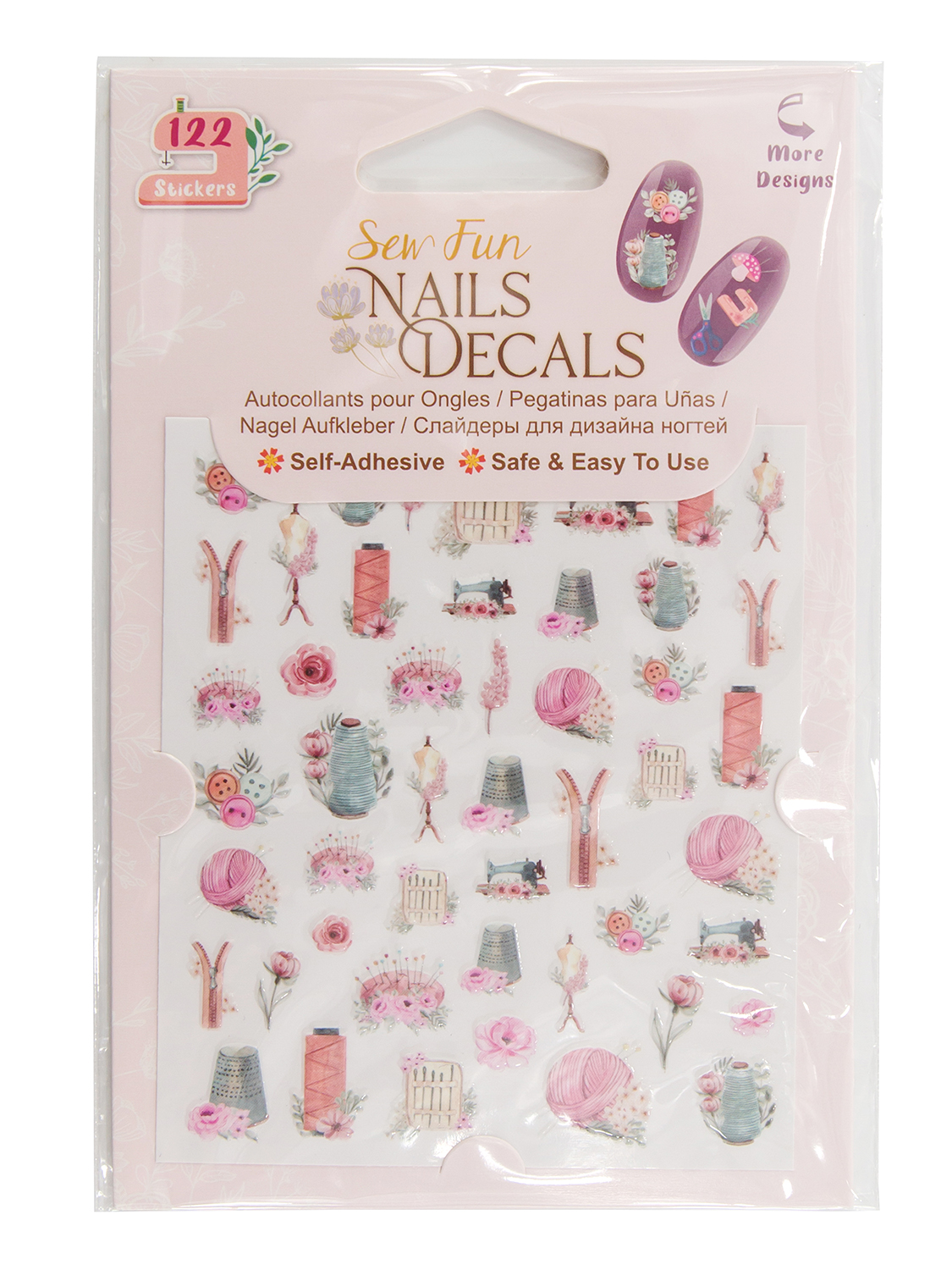 Слайдеры для дизайна ногтей. Самоклеющиеся. Безопасны и просты в использовании. Соответствует стандартам безопасности EN-71, ASTM, FDA. Каждая упаковка содержит 122 наклейки в швейных тематических дизайнах. На упаковке указана инструкция по использованию.Размеры изделия: W9,5 x D0,2 x H14 см. Размеры дисплея: W10 x D20 x H14 см. Вес брутто товара: 340 г.