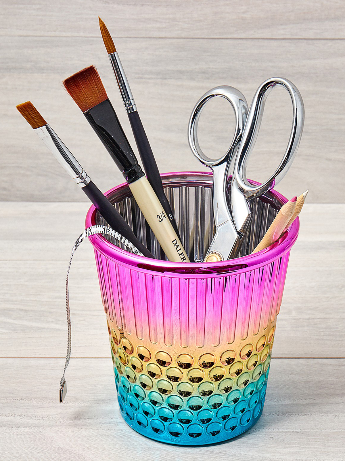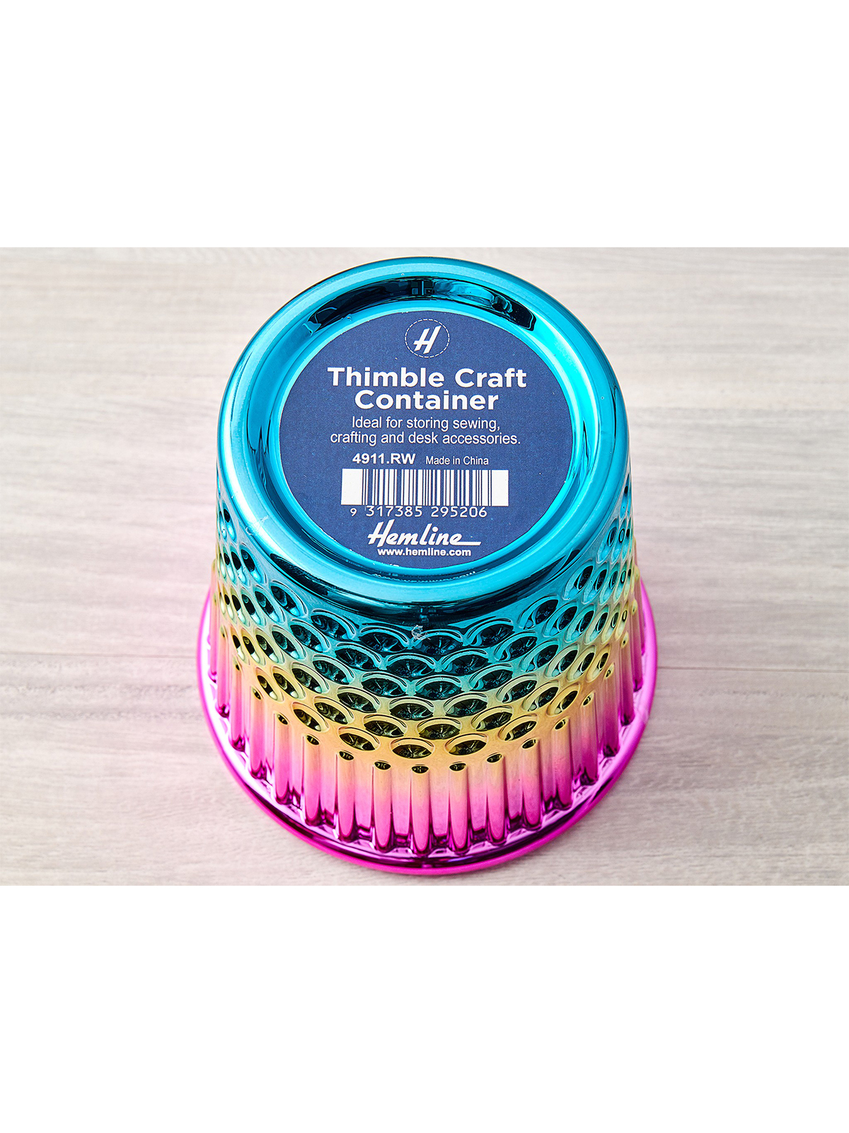 Настольный контейнер с дизайном «наперсток». Толстая пластиковая конструкция радужного цвета. Идеально подходит для хранения швейных, рукодельных и офисных принадлежностей. Новый подарок/решение для хранения для любителей шитья и рукоделия. Этикетка со штрих-кодом на нижней кромке снизу. Размеры товара: 12 x 12 x 12,3 см (4,7” x 4,7” x 4,8”). Вес брутто товара: 115 г.