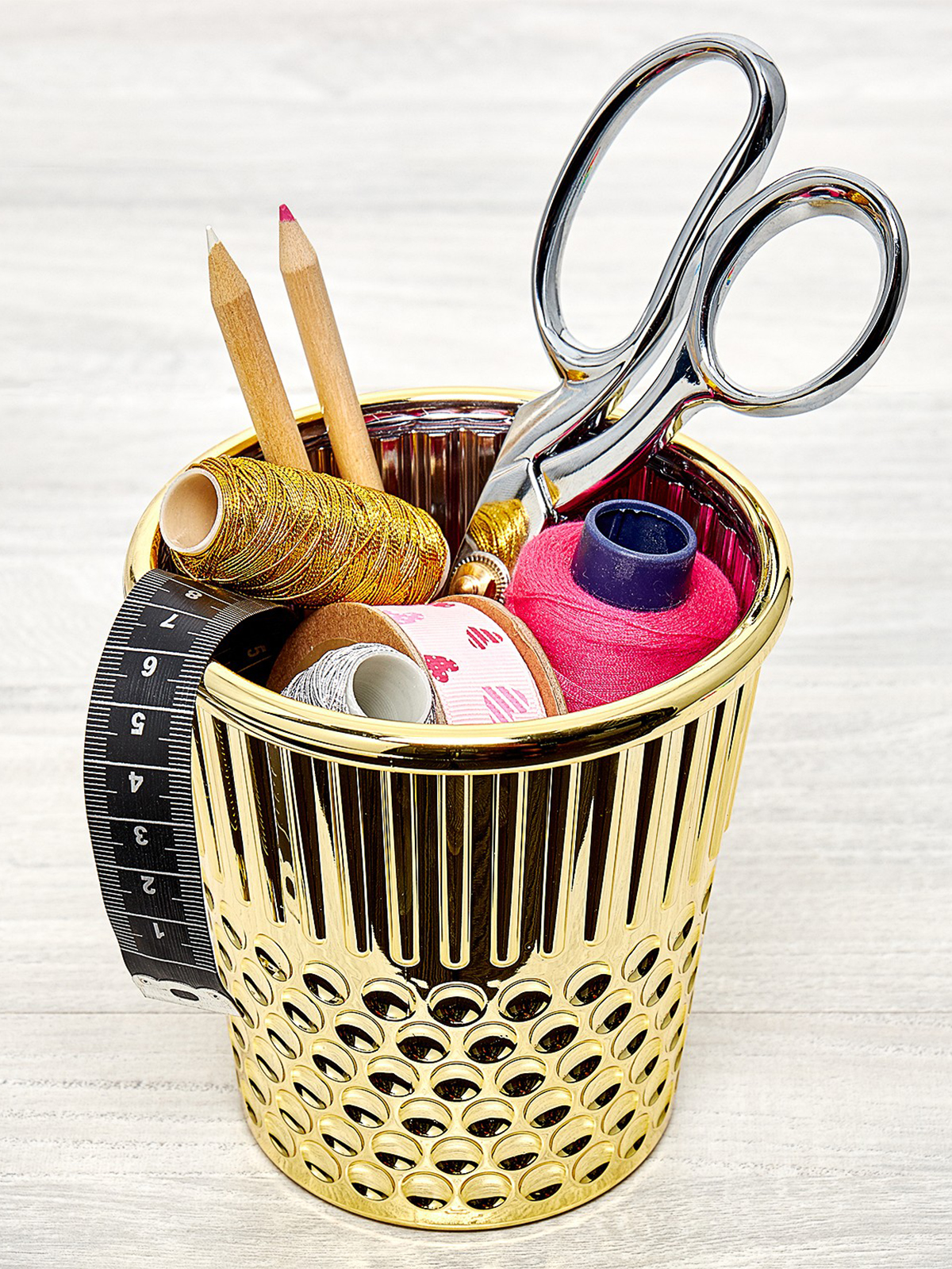 Настольный контейнер с дизайном «наперсток». Толстая пластиковая конструкция радужного цвета. Идеально подходит для хранения швейных, рукодельных и офисных принадлежностей. Новый подарок/решение для хранения для любителей шитья и рукоделия. Этикетка со штрих-кодом на нижней кромке снизу. Размеры товара: 12 x 12 x 12,3 см. Вес брутто товара: 115 г.