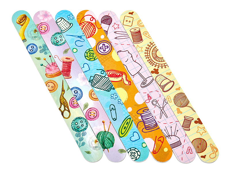 Пилочки для ногтей двусторонние с высококачественным абразивным покрытием, гибкие и прочные, представлены на акриловом прикассовом стенде, по 48 штук в каждом. В наборе 6 цветов со швейными принтами: бирюзовый, голубой, светло-сиреневый, оранжевый, желтый, светло-розовый. Используются для регулирования длины ногтей и придания им нужной формы. Размер набора: 14,5 x 7 x 19 см, размер пилочки: 17,8 x 2 x 0,35 см.