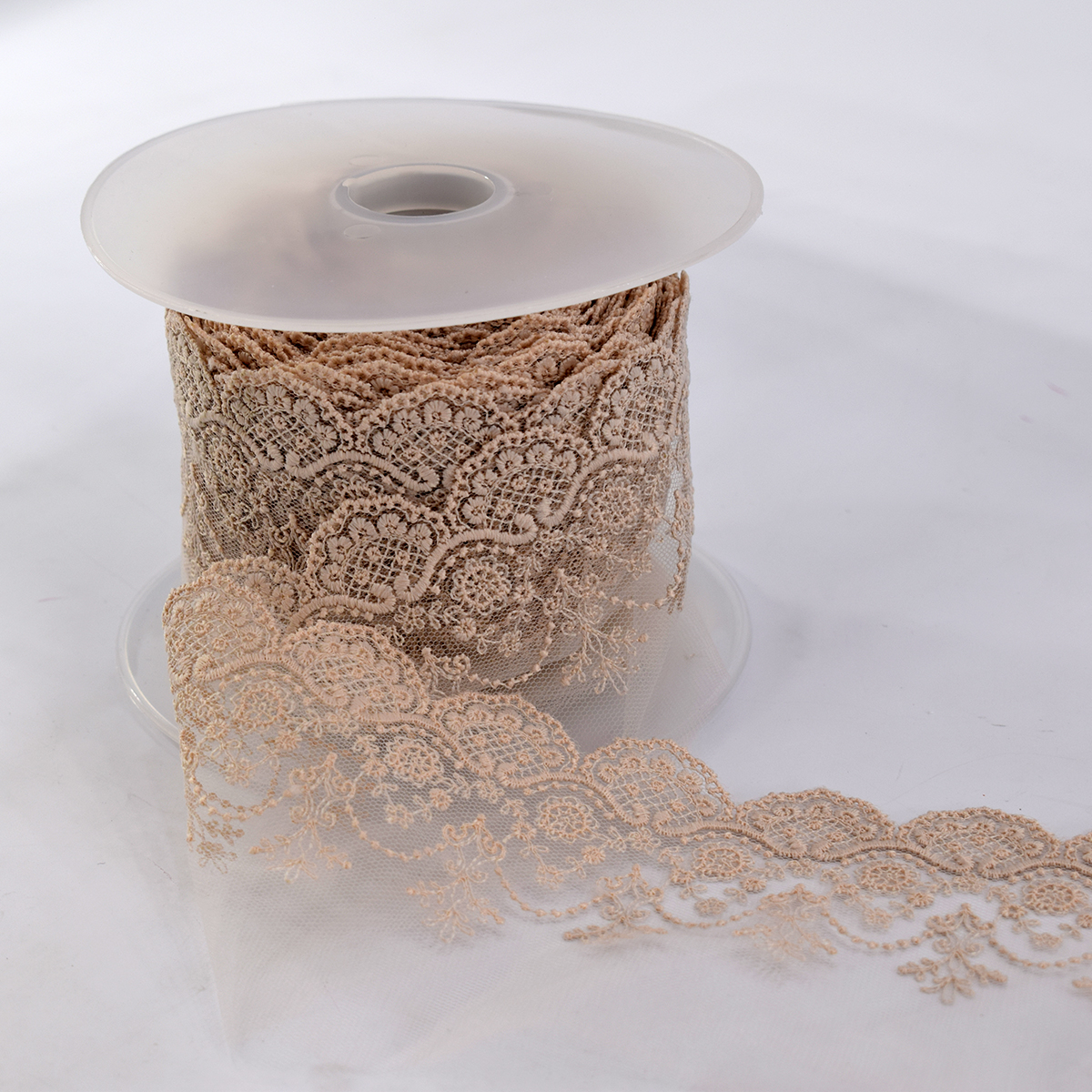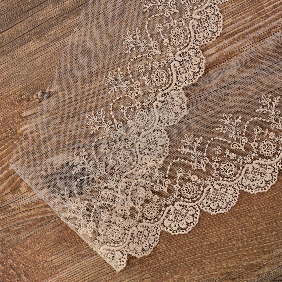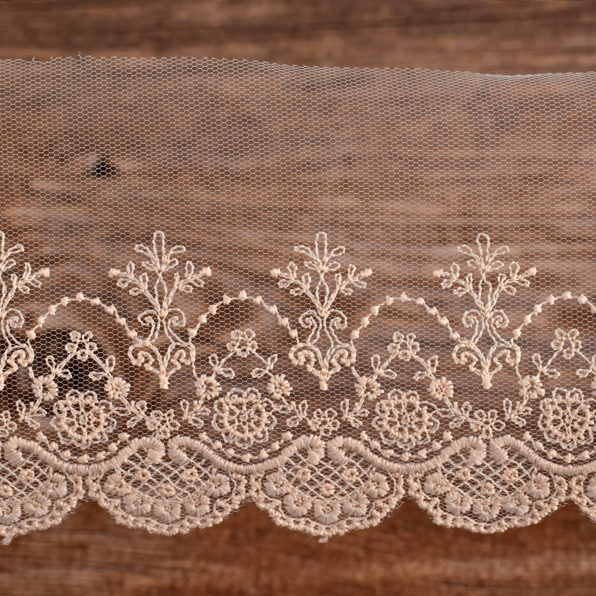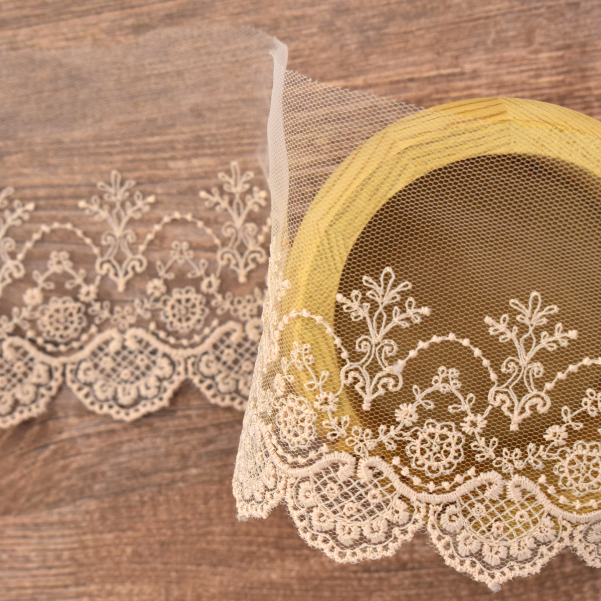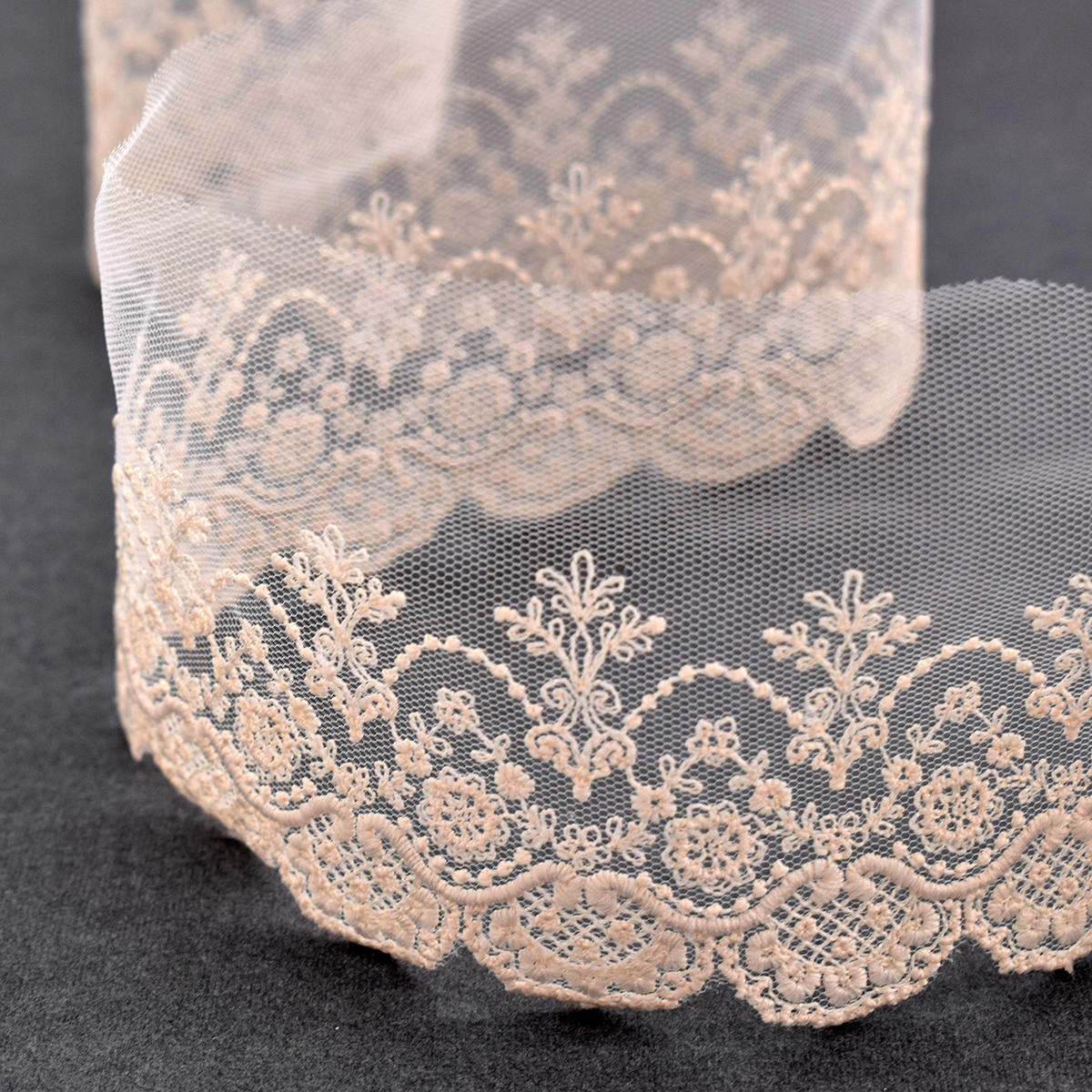 Вышивка выполнена матовыми полиэстеровыми нитями №110. Тюль-основа из 100% полиэстера имеет запас на растяжимость, не дает стягивания швов, края не осыпаются. Применяется для отделки свадебных и нарядных женских платьев. Также применяется для отделки женских платьев, юбок и жакетов из легких и средней плотности тканей, например сукна и габардина; великолепно подходит для отделки женского белья и одежды из трикотажа; изысканно смотрится как отделка вязаных изделий. Кружево на тюле мягкое, удобно в носке и легкое в уходе, не мнется. Стирать в режиме деликатной стирки, сушить в расправленном виде, гладить с изнаночной стороны в 1 или 2 температурном режиме.