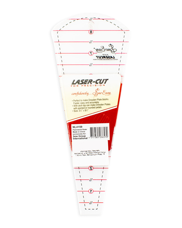 Позволяет легко и точно выкроить лепестки «Дрезденской тарелки» с полукруглым завершением, а также крой завершения классическим клином. Шаг 1/2 дюйма, припуски по краю 1/4 дюйма.