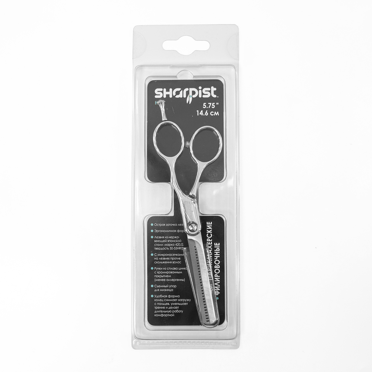 Ножницы филировочные «Sharpist Hair» с эргономичной формой (арт. SHF06575) предназначены для прореживания густых и непослушных волос, придания формы прическе, создания плавных переходов. Длина ножниц 5.75”/14,6 см. Форма ножниц – прямая, с микронасечками на лезвиях против скольжения волос. Лезвие с зубчиками (30 шт) - с одной стороны. Лезвия сделаны из нержавеющей японской стали марки 420J2 и твердости 50-55HRC. Ручки из сплава цинка с хромированным покрытием (менее аллергенны). На кольце есть съемный упор для мизинца и ограничитель. Удобная форма колец снимает нагрузку с пальцев, уменьшает трение и делает длительную работу комфортной.