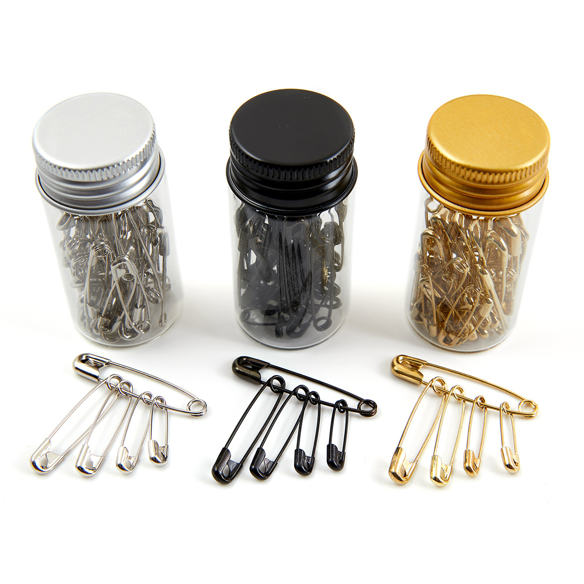 Английские булавки из углеродистой стали черного, золотого и серебряного цвета. Английские булавки разных размеров: 19, 23, 27, 34, 38 мм x 10 шт., 50 шт. в банке. Каждая стеклянная банка с металлической крышкой соответствующего цвета. Штрих-код на каждой стеклянной банке Цвета: черный, золотой и серебряный. Материал содержимого: металл из углеродистой стали. Размеры стеклянной банки: диаметр 2,8 см, высота 6 см. Размеры дисплея (в закрытом виде): Ш11 x Г19 x В6,7 см. Размеры дисплея (сборные): Ш11 x Г19 x В12,5 см. Вес брутто дисплея: 725 г.