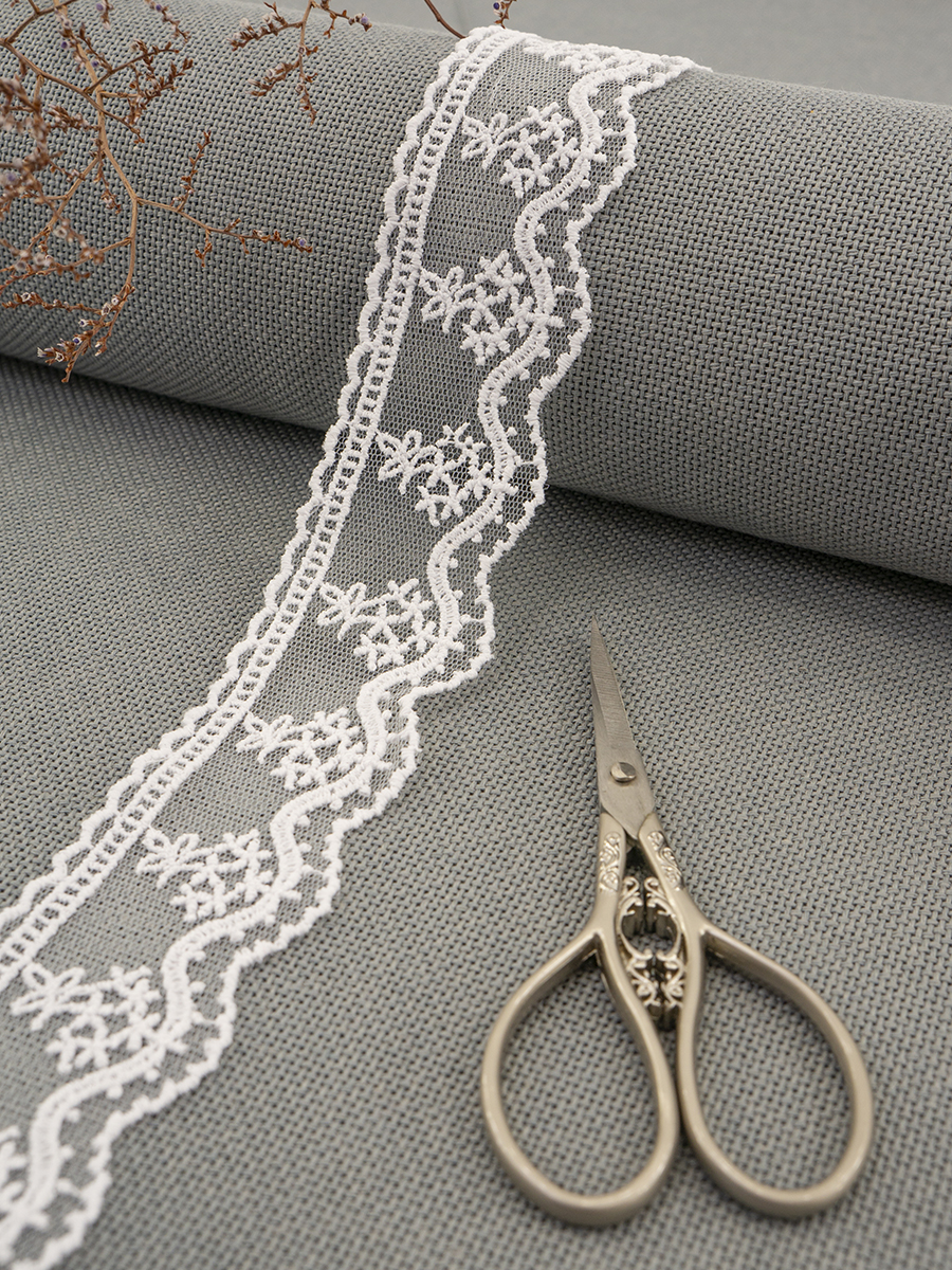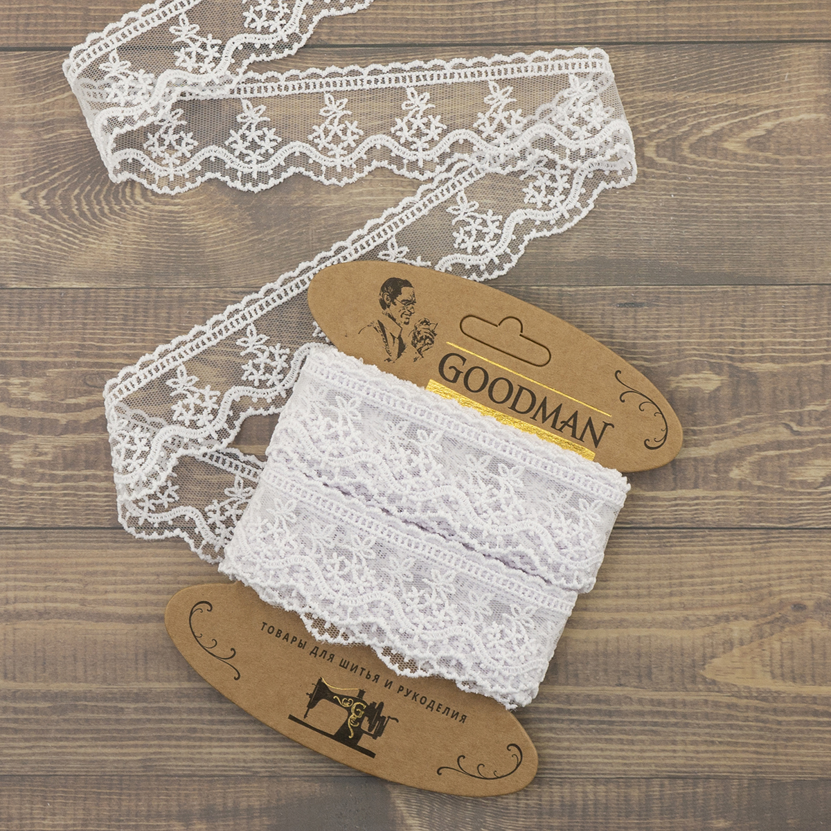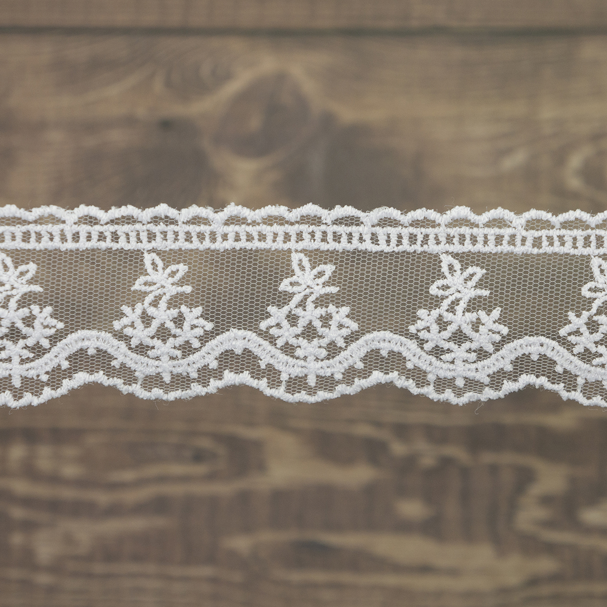 Вышивка выполнена матовыми полиэстеровыми нитями №110. Тюль-основа из 100% полиэстера белого цвета имеет запас на растяжимость, не дает стягивания швов, края не осыпаются. Применяется для отделки свадебных и нарядных женских платьев. Также применяется для отделки женских платьев, юбок и жакетов из легких и средней плотности тканей, например сукна и габардина; великолепно подходит для отделки женского белья и одежды из трикотажа; изысканно смотрится как отделка вязаных изделий. Кружево на тюле мягкое, удобно в носке и легкое в уходе, не мнется. Стирать в режиме деликатной стирки, сушить в расправленном виде, гладить с изнаночной стороны в 1 или 2 температурном режиме.