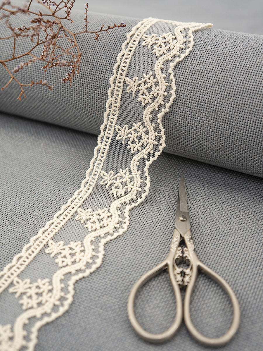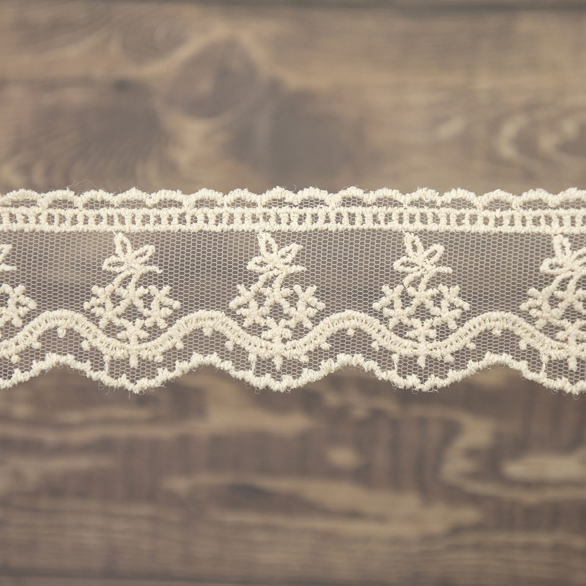 Вышивка выполнена матовыми полиэстеровыми нитями №110. Тюль-основа из 100% полиэстера белого цвета имеет запас на растяжимость, не дает стягивания швов, края не осыпаются. Применяется для отделки свадебных и нарядных женских платьев. Также применяется для отделки женских платьев, юбок и жакетов из легких и средней плотности тканей, например сукна и габардина; великолепно подходит для отделки женского белья и одежды из трикотажа; изысканно смотрится как отделка вязаных изделий. Кружево на тюле мягкое, удобно в носке и легкое в уходе, не мнется. Стирать в режиме деликатной стирки, сушить в расправленном виде, гладить с изнаночной стороны в 1 или 2 температурном режиме.