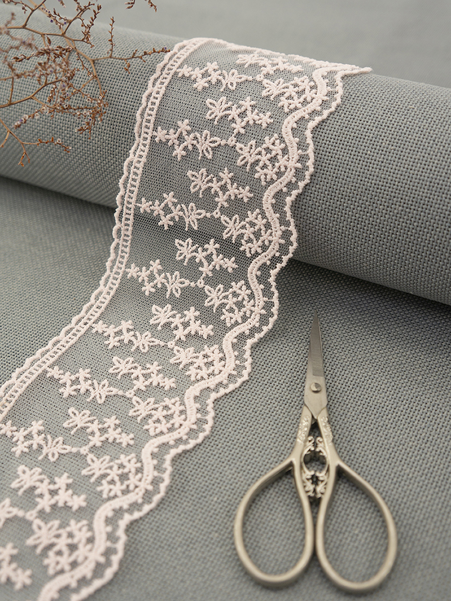 Вышивка выполнена матовыми полиэстеровыми нитями №110. Тюль-основа из 100% полиэстера белого цвета имеет запас на растяжимость, не дает стягивания швов, края не осыпаются. Применяется для отделки свадебных и нарядных женских платьев. Также применяется для отделки женских платьев, юбок и жакетов из легких и средней плотности тканей, например сукна и габардина; великолепно подходит для отделки женского белья и одежды из трикотажа; изысканно смотрится как отделка вязаных изделий. Кружево на тюле мягкое, удобно в носке и легкое в уходе, не мнется. Стирать в режиме деликатной стирки, сушить в расправленном виде, гладить с изнаночной стороны в 1 или 2 температурном режиме.