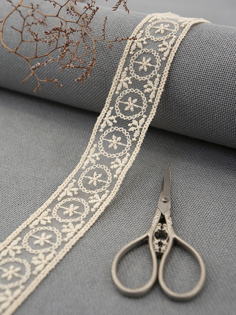 Вышивка выполнена матовыми полиэстеровыми нитями №110. Тюль-основа из 100% полиэстера белого цвета имеет запас на растяжимость, не дает стягивания швов, края не осыпаются. Применяется для отделки свадебных и нарядных женских платьев. Также применяется для отделки женских платьев, юбок и жакетов из легких и средней плотности тканей, например сукна и габардина; великолепно подходит для отделки женского белья и одежды из трикотажа; изысканно смотрится как отделка вязаных изделий. Кружево на тюле мягкое, удобно в носке и легкое в уходе, не мнется. Стирать в режиме деликатной стирки, сушить в расправленном виде, гладить с изнаночной стороны в 1 или 2 температурном режиме.