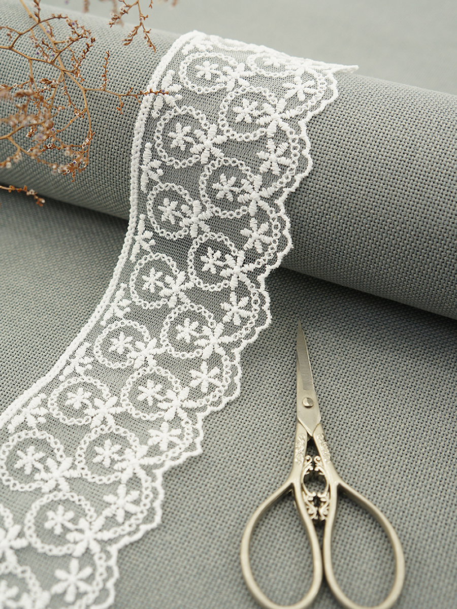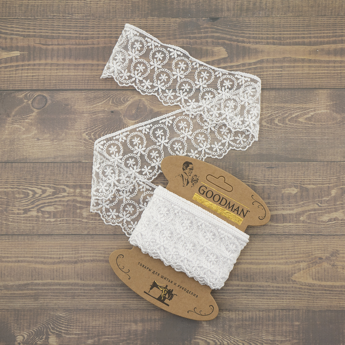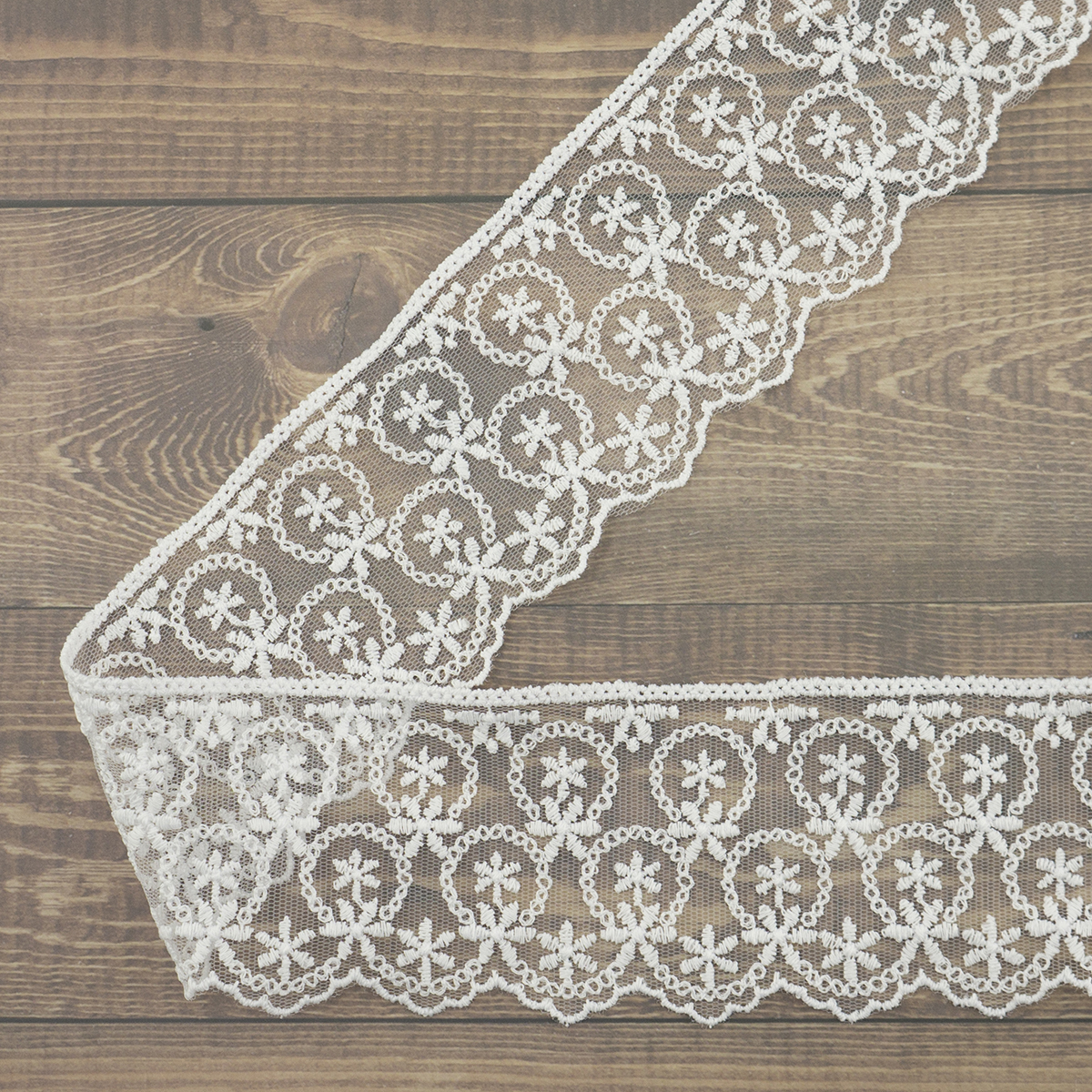 Вышивка выполнена матовыми полиэстеровыми нитями №110. Тюль-основа из 100% полиэстера белого цвета имеет запас на растяжимость, не дает стягивания швов, края не осыпаются. Применяется для отделки свадебных и нарядных женских платьев. Также применяется для отделки женских платьев, юбок и жакетов из легких и средней плотности тканей, например сукна и габардина; великолепно подходит для отделки женского белья и одежды из трикотажа; изысканно смотрится как отделка вязаных изделий. Кружево на тюле мягкое, удобно в носке и легкое в уходе, не мнется. Стирать в режиме деликатной стирки, сушить в расправленном виде, гладить с изнаночной стороны в 1 или 2 температурном режиме.