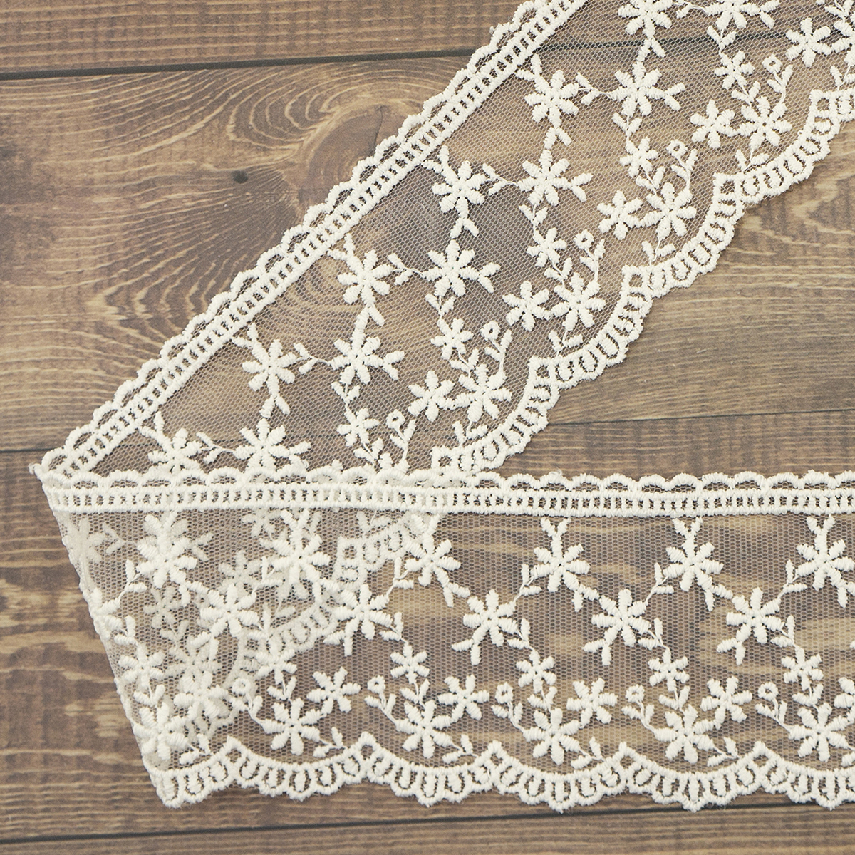 Вышивка выполнена матовыми полиэстеровыми нитями №110. Тюль-основа из 100% полиэстера белого цвета имеет запас на растяжимость, не дает стягивания швов, края не осыпаются. Применяется для отделки свадебных и нарядных женских платьев. Также применяется для отделки женских платьев, юбок и жакетов из легких и средней плотности тканей, например сукна и габардина; великолепно подходит для отделки женского белья и одежды из трикотажа; изысканно смотрится как отделка вязаных изделий. Кружево на тюле мягкое, удобно в носке и легкое в уходе, не мнется. Стирать в режиме деликатной стирки, сушить в расправленном виде, гладить с изнаночной стороны в 1 или 2 температурном режиме.