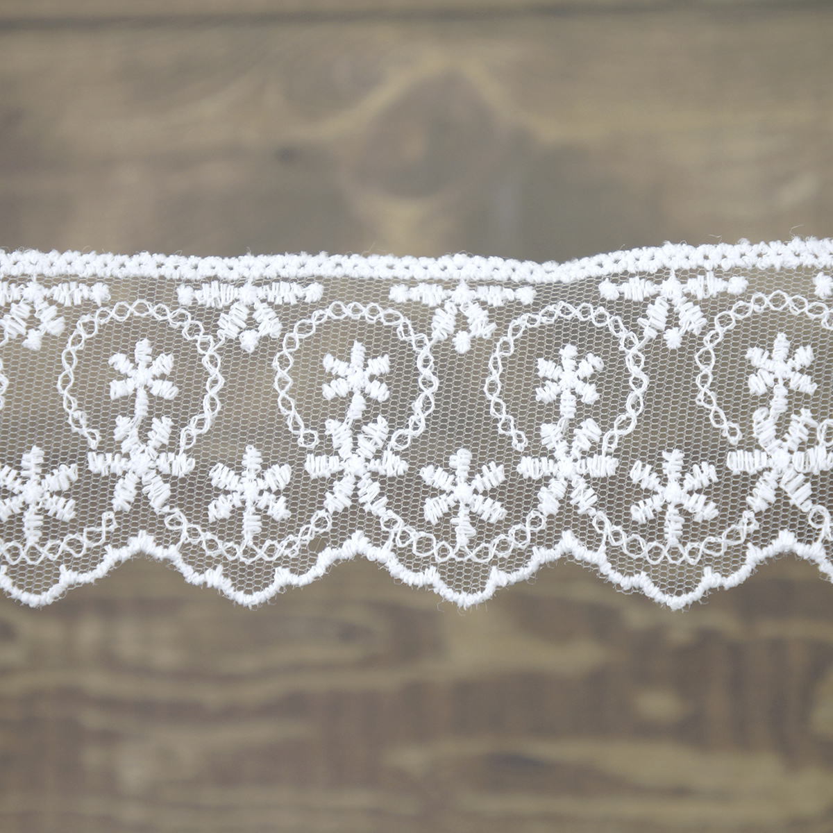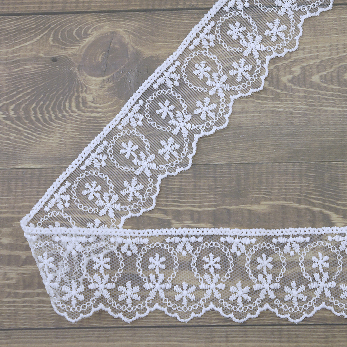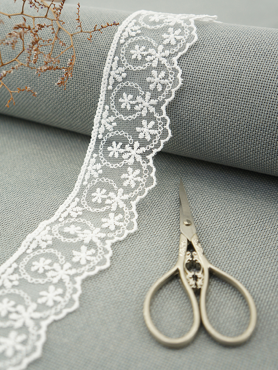 Вышивка выполнена матовыми полиэстеровыми нитями №110. Тюль-основа из 100% полиэстера белого цвета имеет запас на растяжимость, не дает стягивания швов, края не осыпаются. Применяется для отделки свадебных и нарядных женских платьев. Также применяется для отделки женских платьев, юбок и жакетов из легких и средней плотности тканей, например сукна и габардина; великолепно подходит для отделки женского белья и одежды из трикотажа; изысканно смотрится как отделка вязаных изделий. Кружево на тюле мягкое, удобно в носке и легкое в уходе, не мнется. Стирать в режиме деликатной стирки, сушить в расправленном виде, гладить с изнаночной стороны в 1 или 2 температурном режиме.