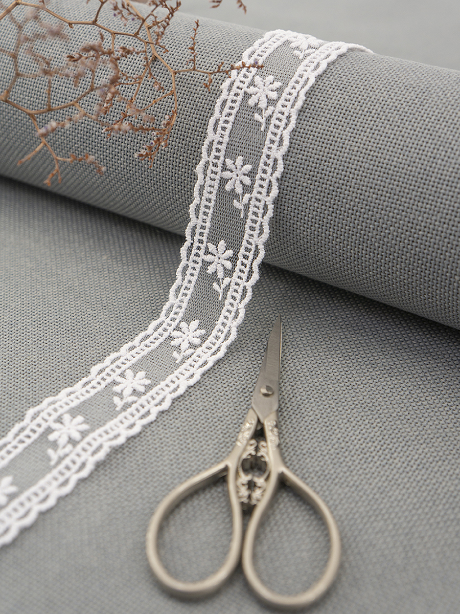 Вышивка выполнена матовыми полиэстеровыми нитями №110. Тюль-основа из 100% полиэстера белого цвета имеет запас на растяжимость, не дает стягивания швов, края не осыпаются. Применяется для отделки свадебных и нарядных женских платьев. Также применяется для отделки женских платьев, юбок и жакетов из легких и средней плотности тканей, например сукна и габардина; великолепно подходит для отделки женского белья и одежды из трикотажа; изысканно смотрится как отделка вязаных изделий. Кружево на тюле мягкое, удобно в носке и легкое в уходе, не мнется. Стирать в режиме деликатной стирки, сушить в расправленном виде, гладить с изнаночной стороны в 1 или 2 температурном режиме.