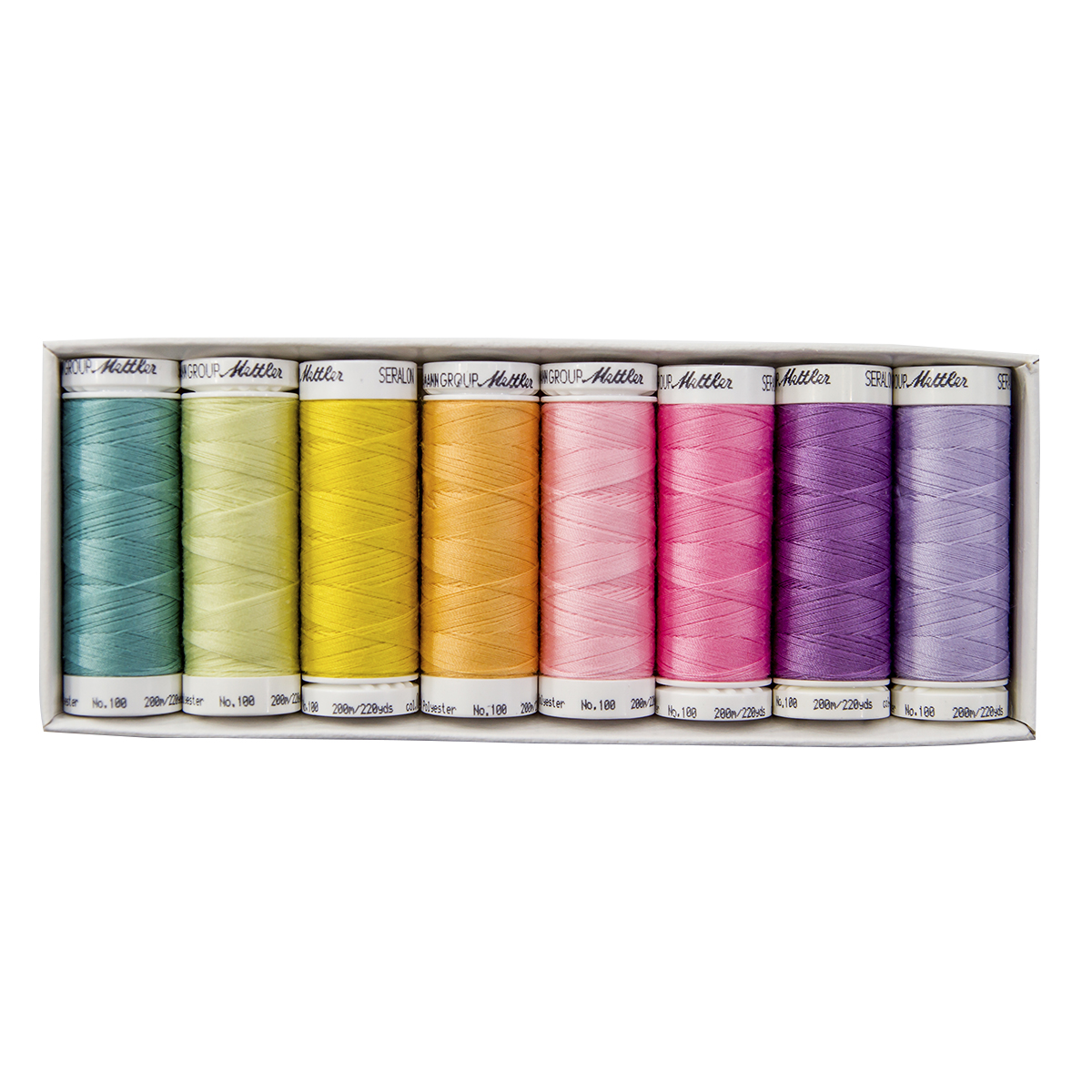 В набор входят 8 катушек нитей SERALON №100, намотка 200 м. Нити предназначены для выполнения стачивающих, отделочных и декоративных строчек на швейной машине и для стежки. Окрас нитей устойчивый.