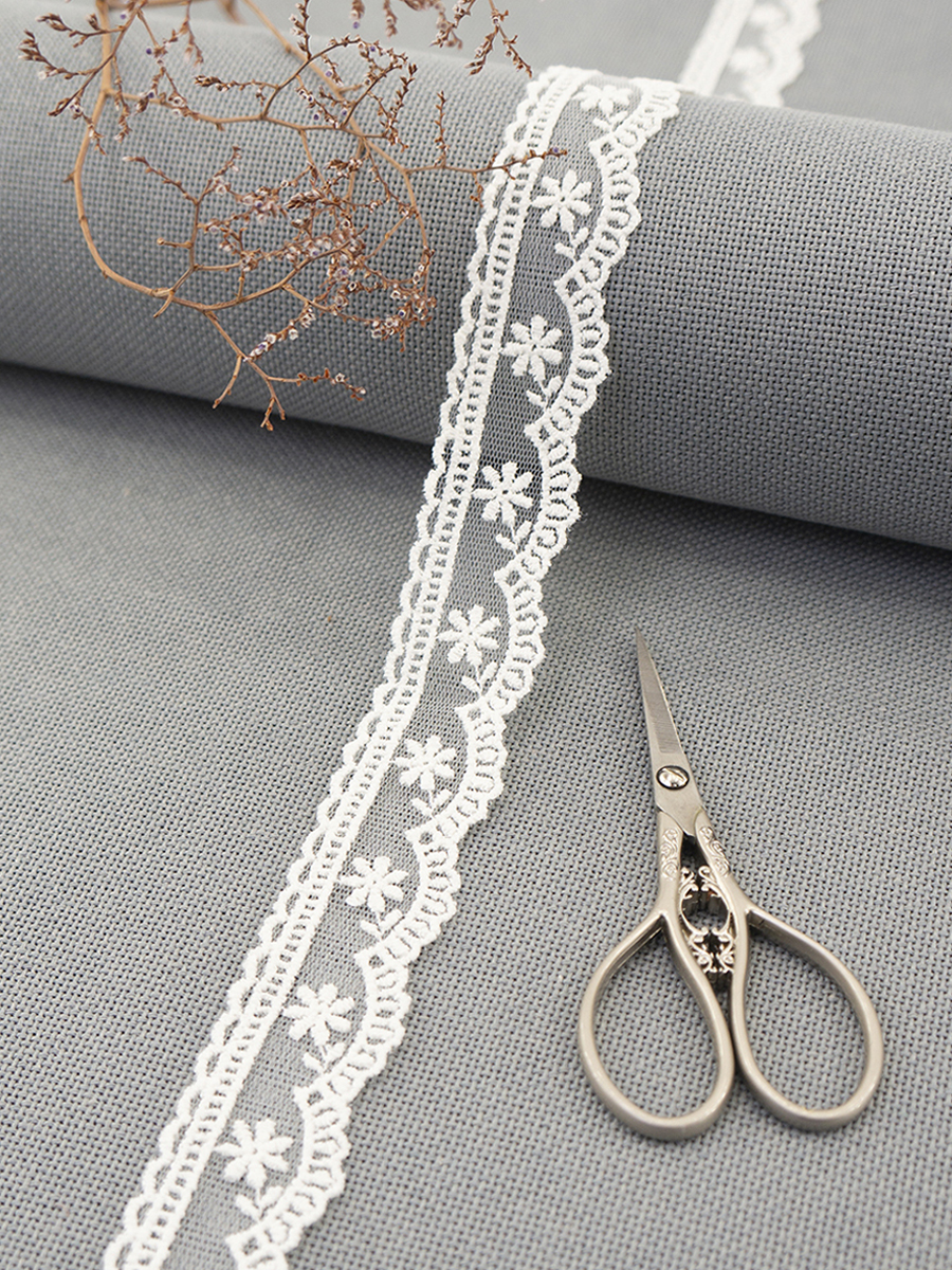 Вышивка выполнена матовыми полиэстеровыми нитями №110. Тюль-основа из 100% полиэстера белого цвета имеет запас на растяжимость, не дает стягивания швов, края не осыпаются. Применяется для отделки свадебных и нарядных женских платьев. Также применяется для отделки женских платьев, юбок и жакетов из легких и средней плотности тканей, например сукна и габардина; великолепно подходит для отделки женского белья и одежды из трикотажа; изысканно смотрится как отделка вязаных изделий. Кружево на тюле мягкое, удобно в носке и легкое в уходе, не мнется. Стирать в режиме деликатной стирки, сушить в расправленном виде, гладить с изнаночной стороны в 1 или 2 температурном режиме.