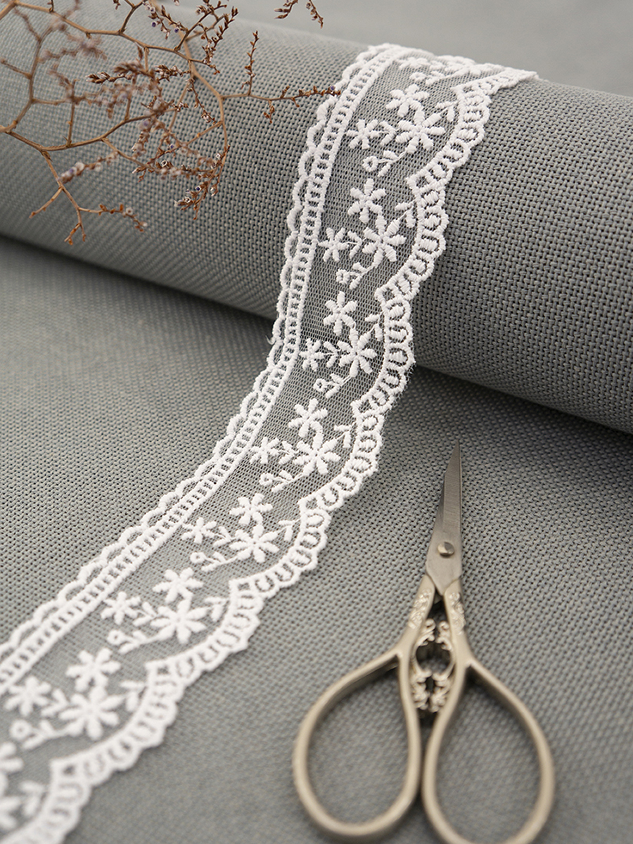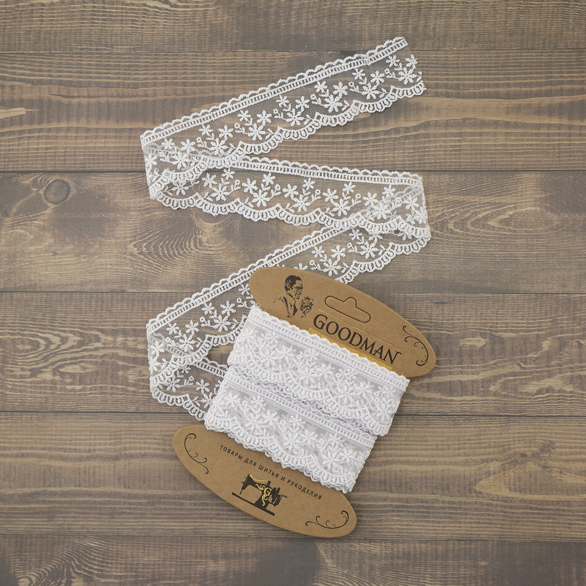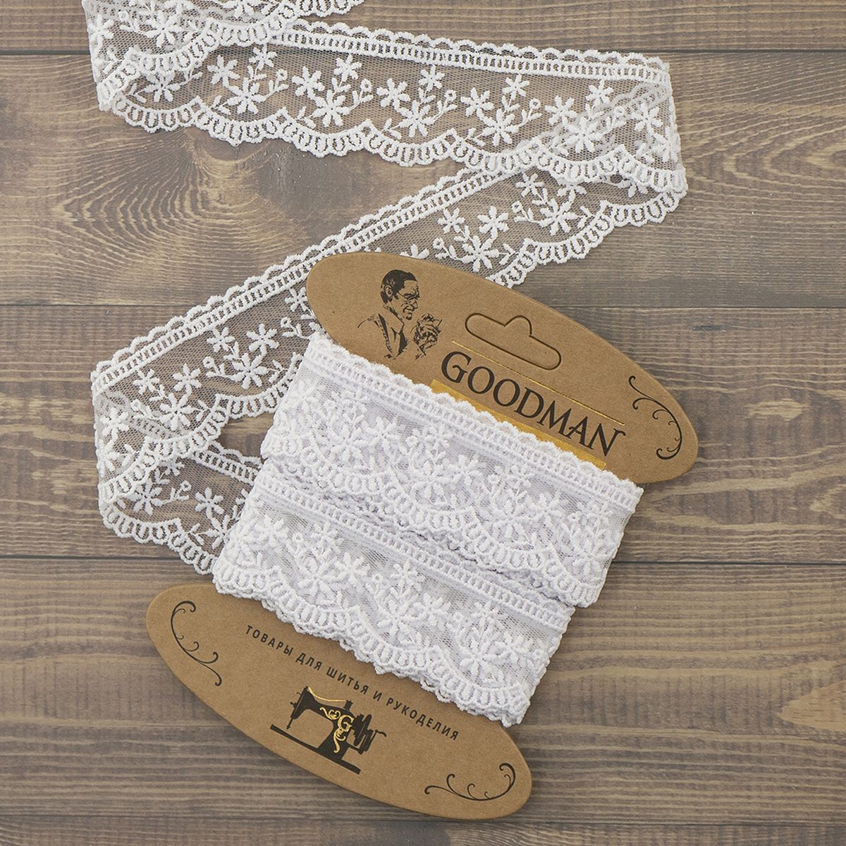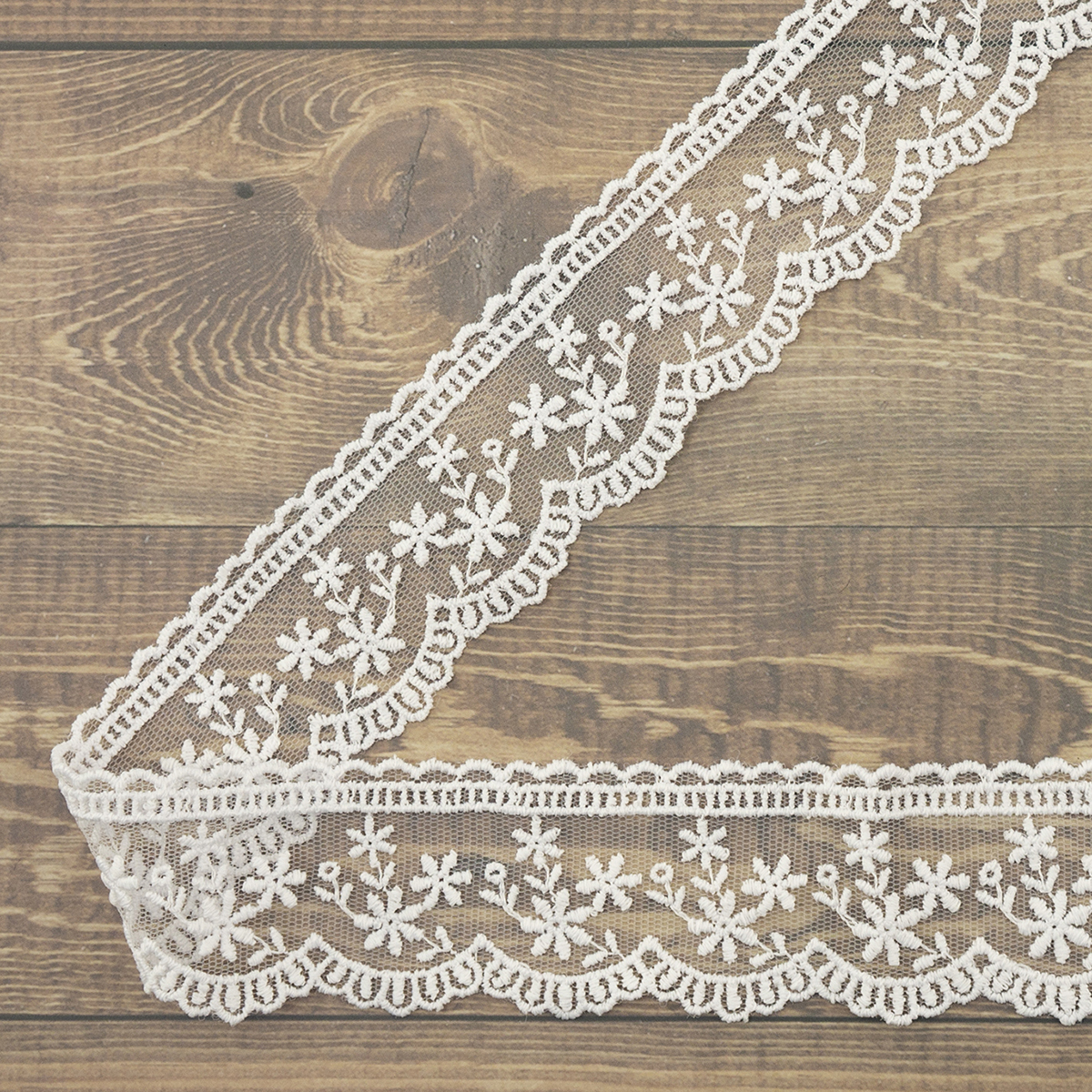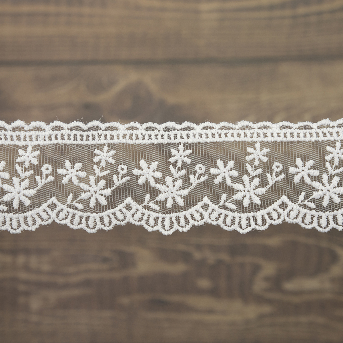 Вышивка выполнена матовыми полиэстеровыми нитями №110. Тюль-основа из 100% полиэстера белого цвета имеет запас на растяжимость, не дает стягивания швов, края не осыпаются. Применяется для отделки свадебных и нарядных женских платьев. Также применяется для отделки женских платьев, юбок и жакетов из легких и средней плотности тканей, например сукна и габардина; великолепно подходит для отделки женского белья и одежды из трикотажа; изысканно смотрится как отделка вязаных изделий. Кружево на тюле мягкое, удобно в носке и легкое в уходе, не мнется. Стирать в режиме деликатной стирки, сушить в расправленном виде, гладить с изнаночной стороны в 1 или 2 температурном режиме.