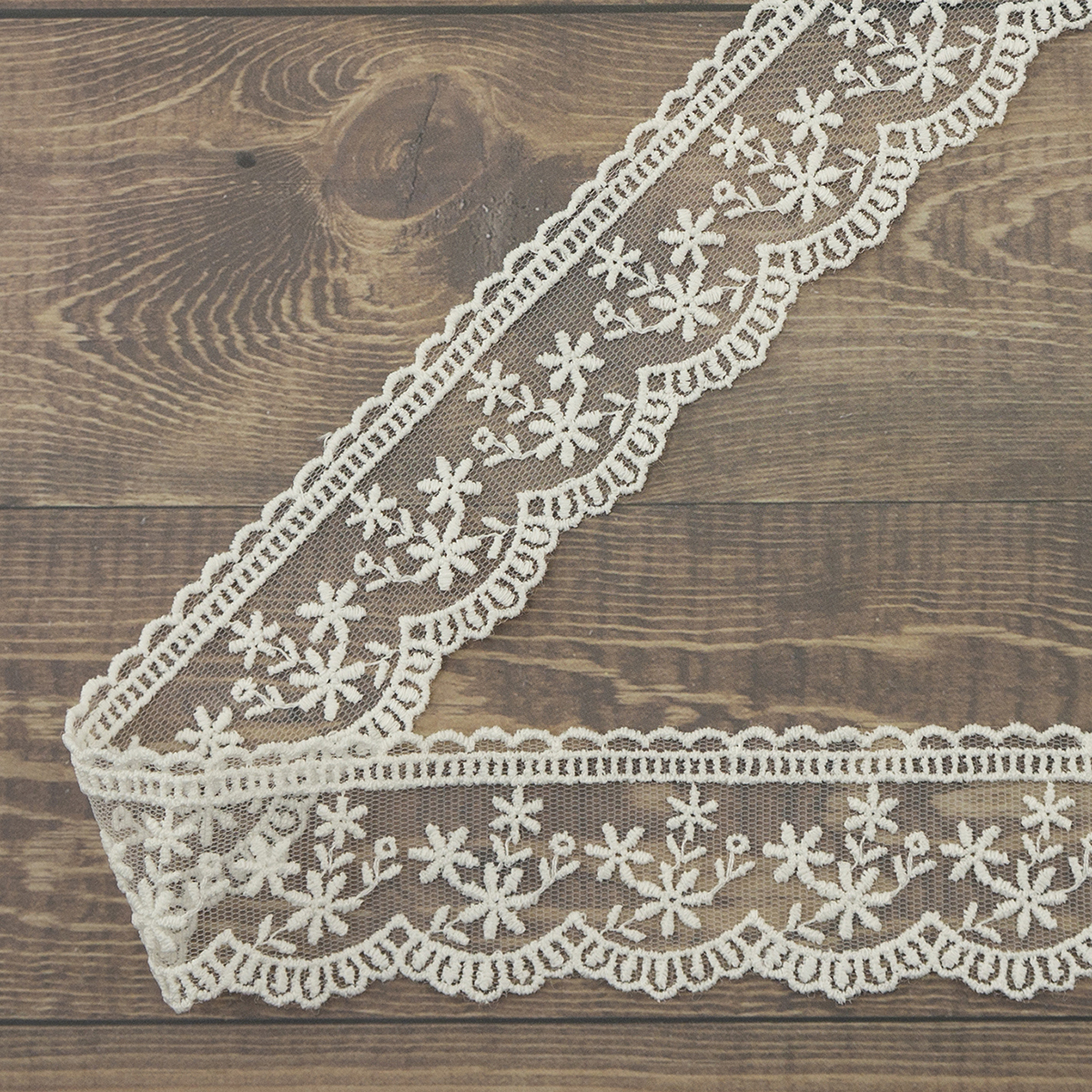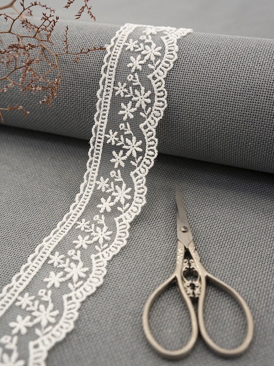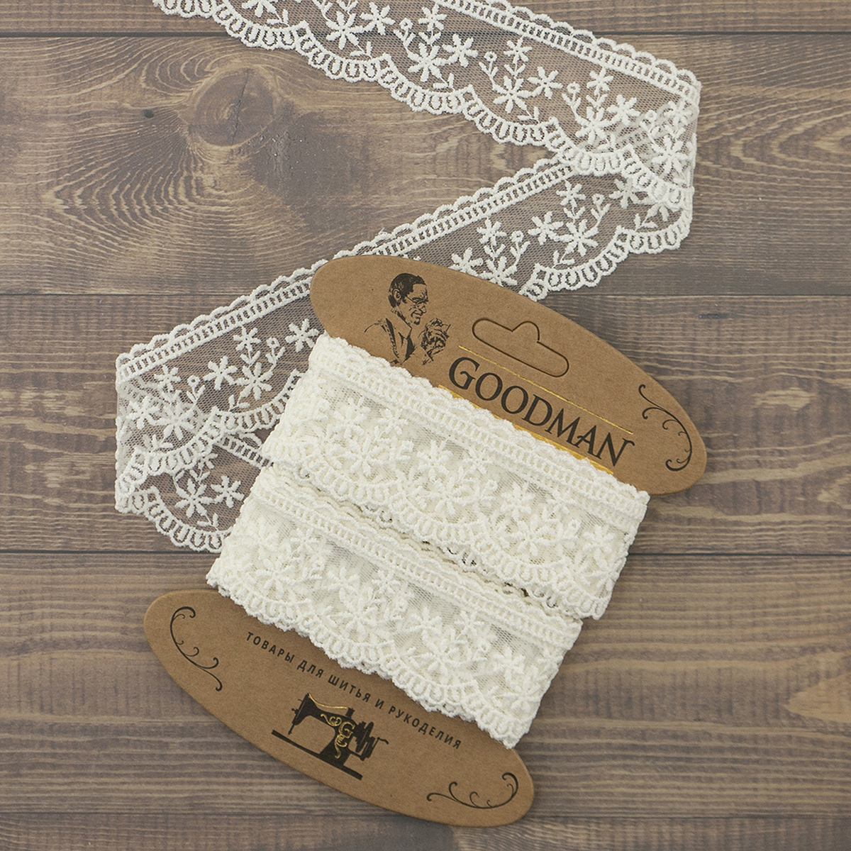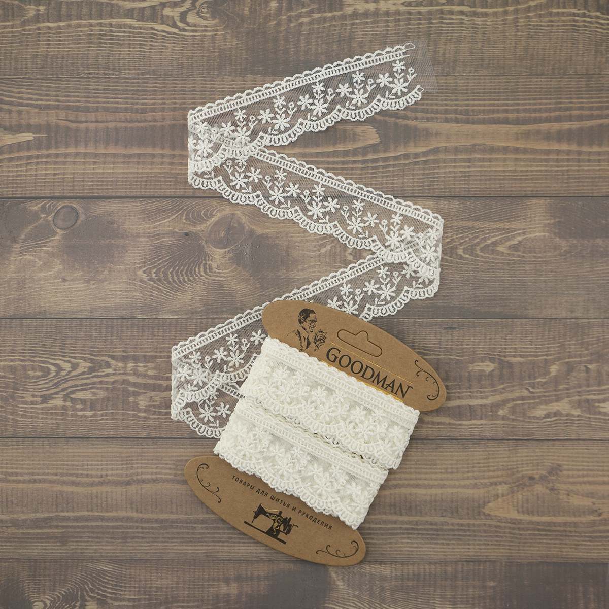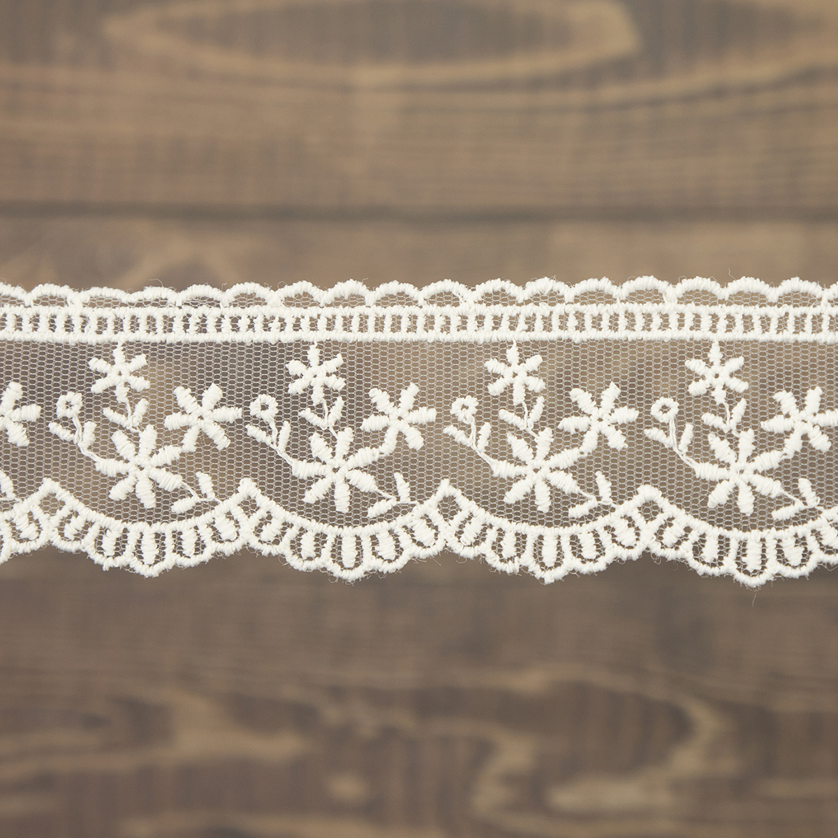 Вышивка выполнена матовыми полиэстеровыми нитями №110. Тюль-основа из 100% полиэстера белого цвета имеет запас на растяжимость, не дает стягивания швов, края не осыпаются. Применяется для отделки свадебных и нарядных женских платьев. Также применяется для отделки женских платьев, юбок и жакетов из легких и средней плотности тканей, например сукна и габардина; великолепно подходит для отделки женского белья и одежды из трикотажа; изысканно смотрится как отделка вязаных изделий. Кружево на тюле мягкое, удобно в носке и легкое в уходе, не мнется. Стирать в режиме деликатной стирки, сушить в расправленном виде, гладить с изнаночной стороны в 1 или 2 температурном режиме.