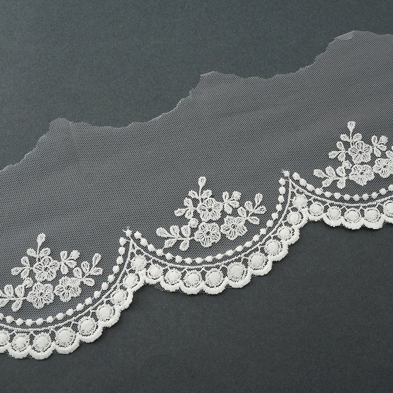 Вышивка выполнена матовыми полиэстеровыми нитями №110. Тюль-основа из 100% полиэстера белого цвета имеет запас на растяжимость, не дает стягивания швов, края не осыпаются. Применяется для отделки свадебных и нарядных женских платьев. Также применяется для отделки женских платьев, юбок и жакетов из легких и средней плотности тканей, например сукна и габардина; великолепно подходит для отделки женского белья и одежды из трикотажа; изысканно смотрится как отделка вязаных изделий. Кружево на тюле мягкое, удобно в носке и легкое в уходе, не мнется. Стирать в режиме деликатной стирки, сушить в расправленном виде, гладить с изнаночной стороны в 1 или 2 температурном режиме.