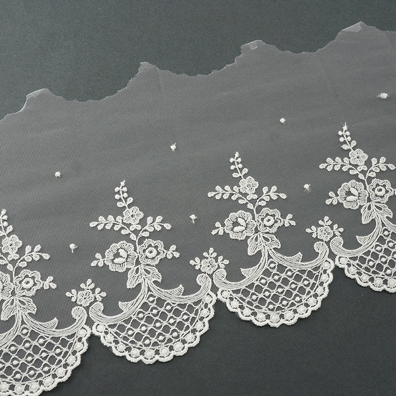 Вышивка выполнена матовыми полиэстеровыми нитями №110. Тюль-основа из 100% полиэстера белого цвета имеет запас на растяжимость, не дает стягивания швов, края не осыпаются. Применяется для отделки свадебных и нарядных женских платьев. Также применяется для отделки женских платьев, юбок и жакетов из легких и средней плотности тканей, например сукна и габардина; великолепно подходит для отделки женского белья и одежды из трикотажа; изысканно смотрится как отделка вязаных изделий. Кружево на тюле мягкое, удобно в носке и легкое в уходе, не мнется. Стирать в режиме деликатной стирки, сушить в расправленном виде, гладить с изнаночной стороны в 1 или 2 температурном режиме.