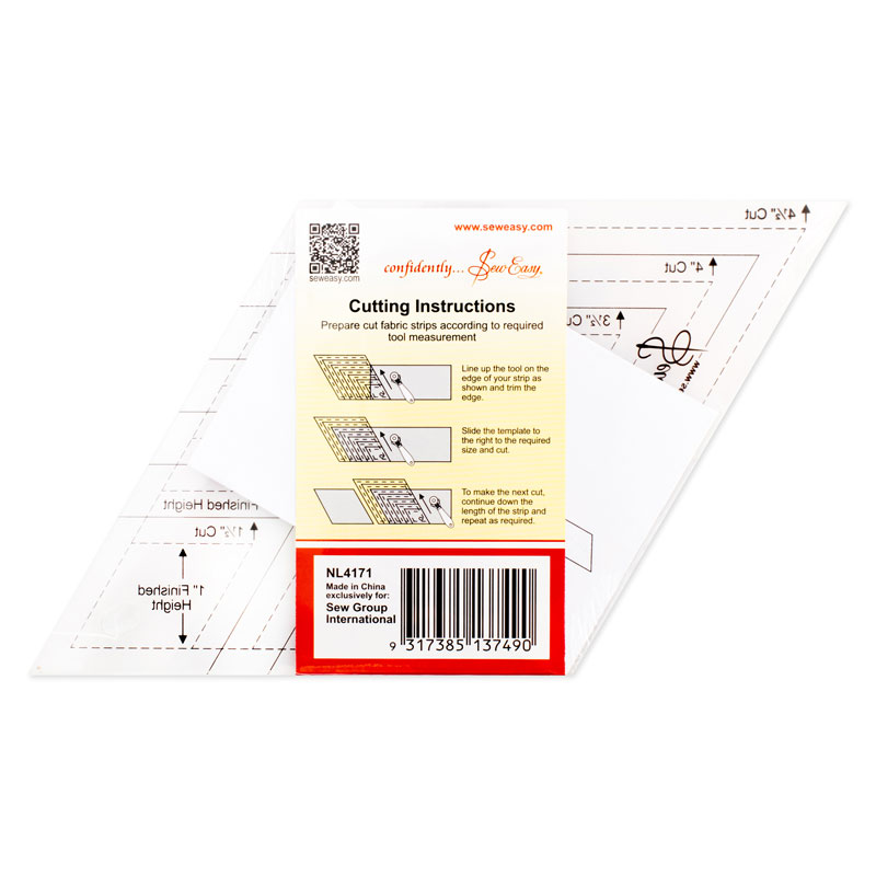 Шаблон предназначен для кроя ромбов и треугольников с углом 60* и изготовления шаблонов для кроя ромбов (или треугольников) меньшего размера. Шаг 1 дюйм. На шаблоне размечены припуски 1/4 дюйма. Цвет разметки чёрный. Инструкция по использованию на русском языке внутри упаковки.