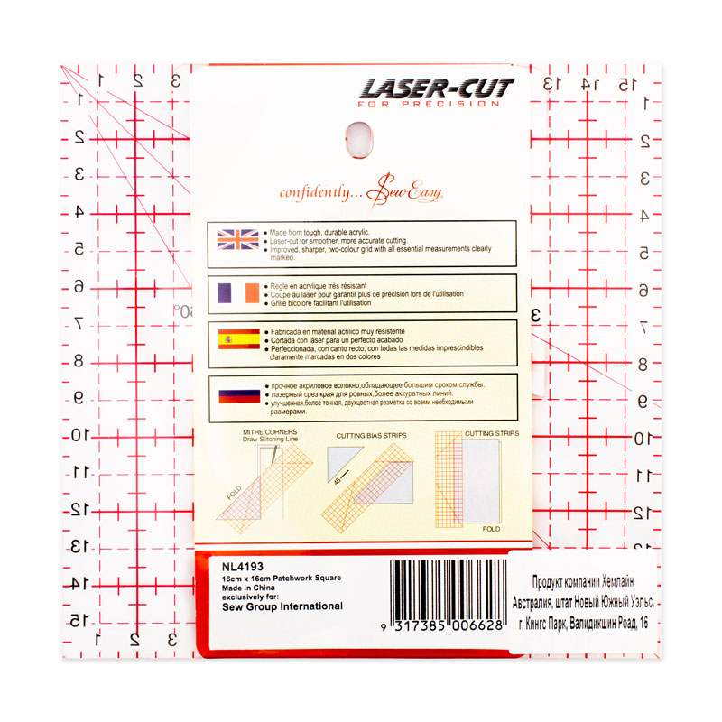 Линейка предназначена для кроя мелких деталей и выравнивания блоков. Градация в сантиметрах, шаг 0,5 см. Расчерчены углы 45*, 60 *, 30*