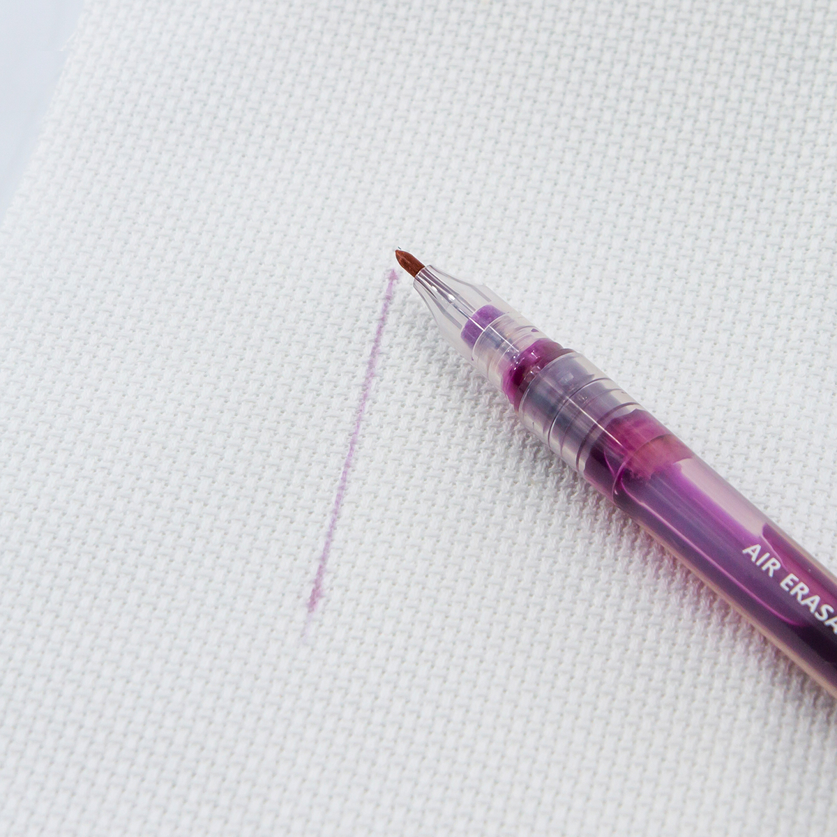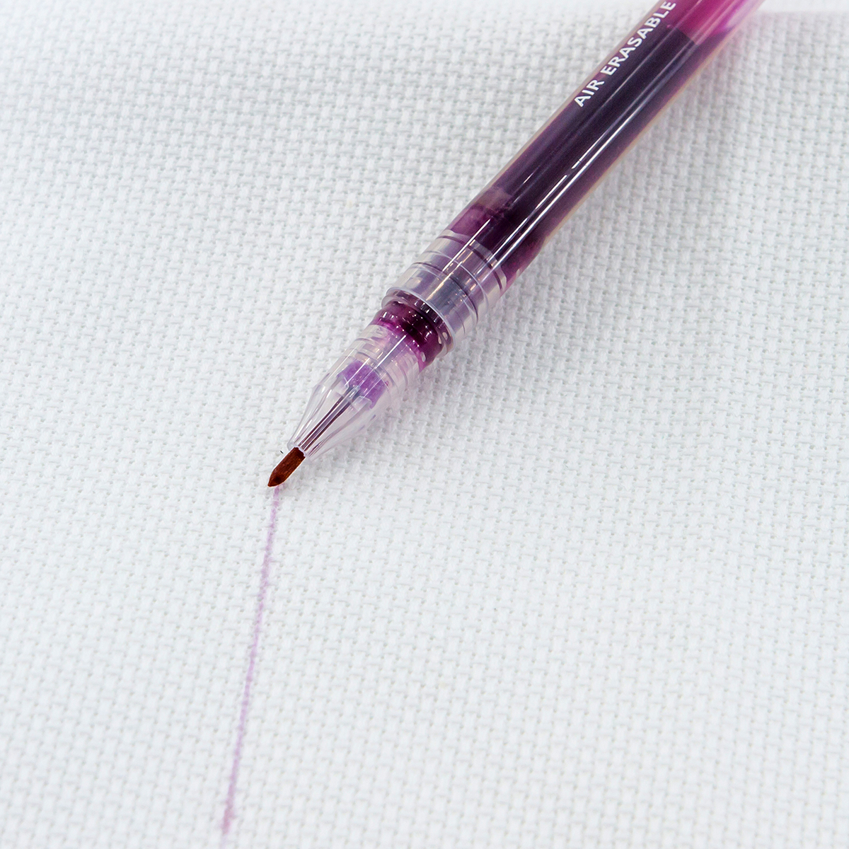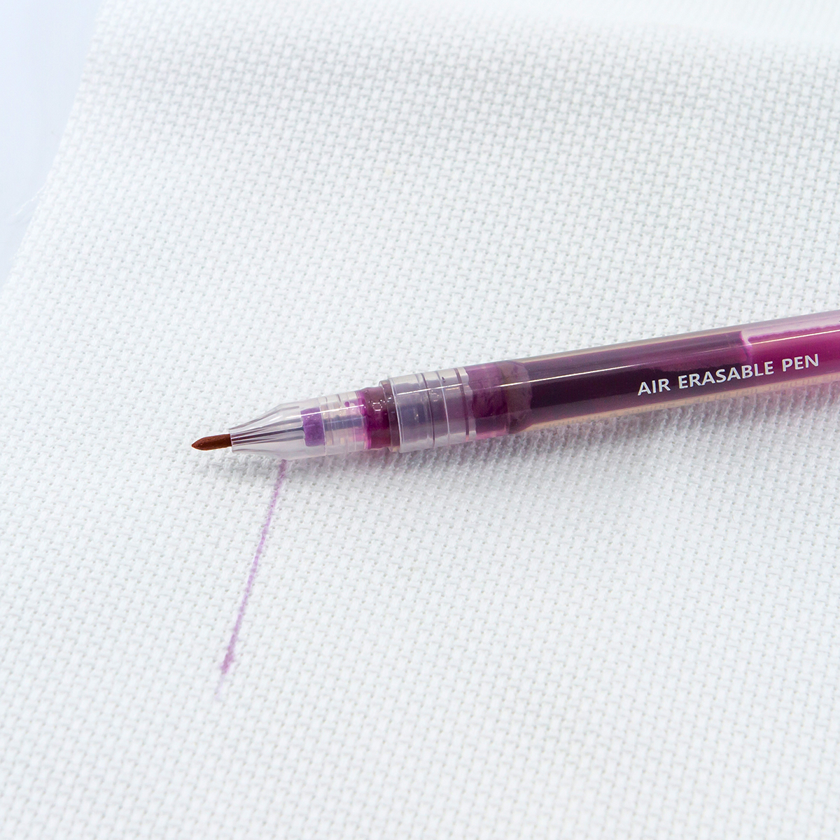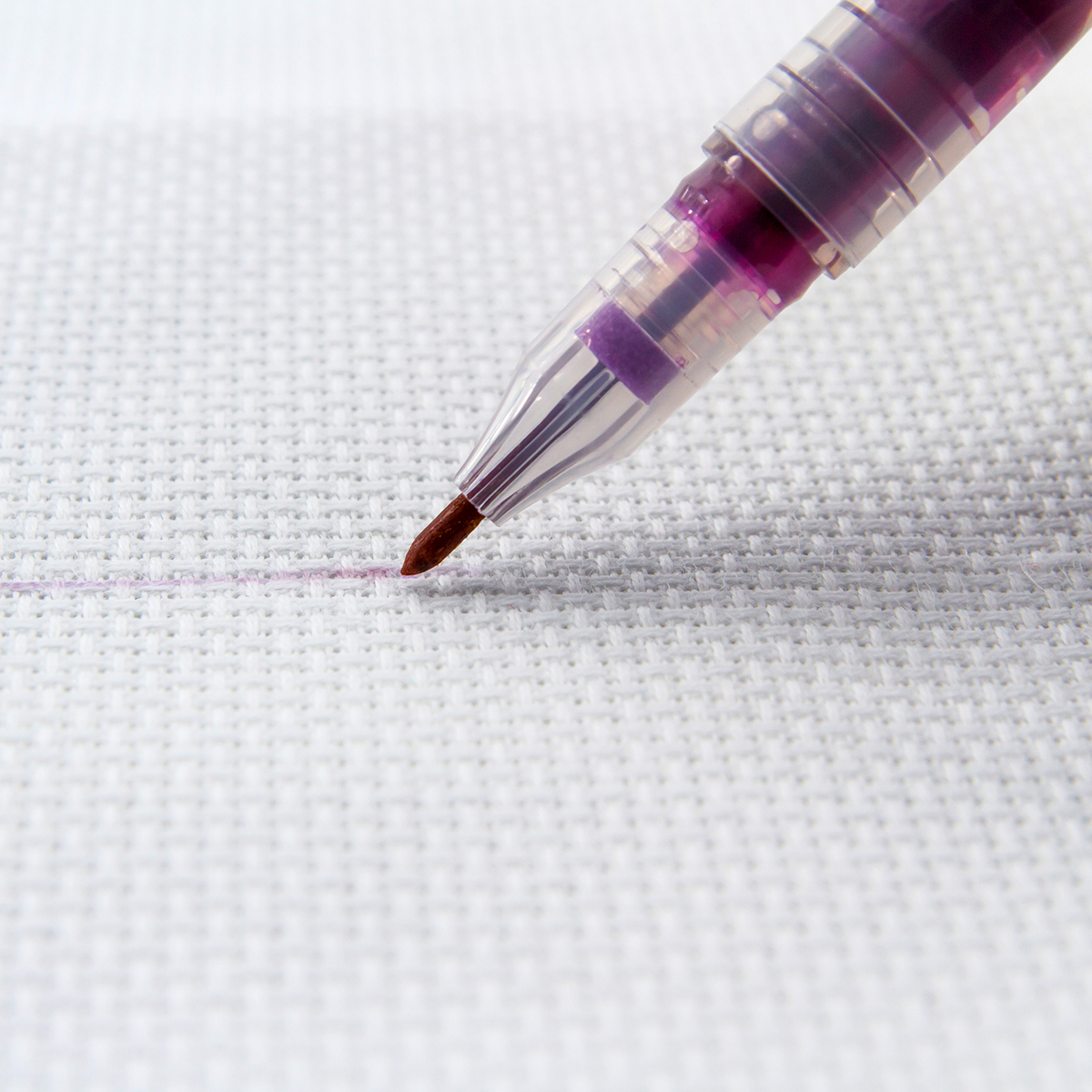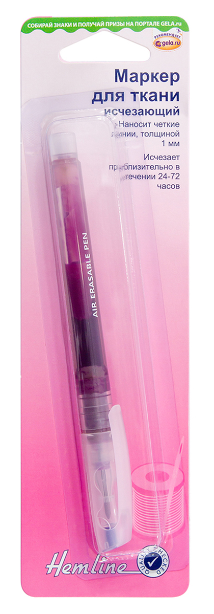 Линия маркера фиолетового цвета, толщина - 1 мм. Линии с ткани исчезают на воздухе в течение 24 - 72 часов. Удаление (исчезновение на воздухе) нанесенных линий на ткани зависит от типа волокна и самой ткани. Поэтому предварительно протестируйте на кусочке ткани, чтобы убедиться, что удаление вас устраивает. При необходимости линии маркера можно досрочно удалить прохладной водой.