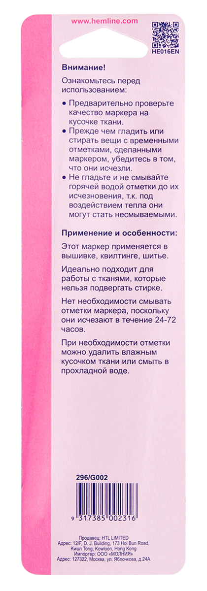 Маркер HEMLINE предназначен для временной разметки на светлой ткани, канве, для нанесения контурных линий выкройки при крое или в пэчворке, для разметки в квилтинге или машинном вышивании. Идеально подходит для тканей, которые не рекомендуется стирать.