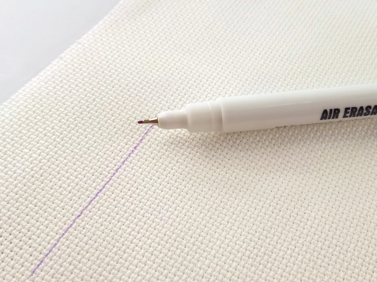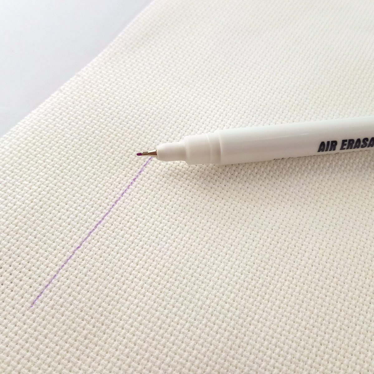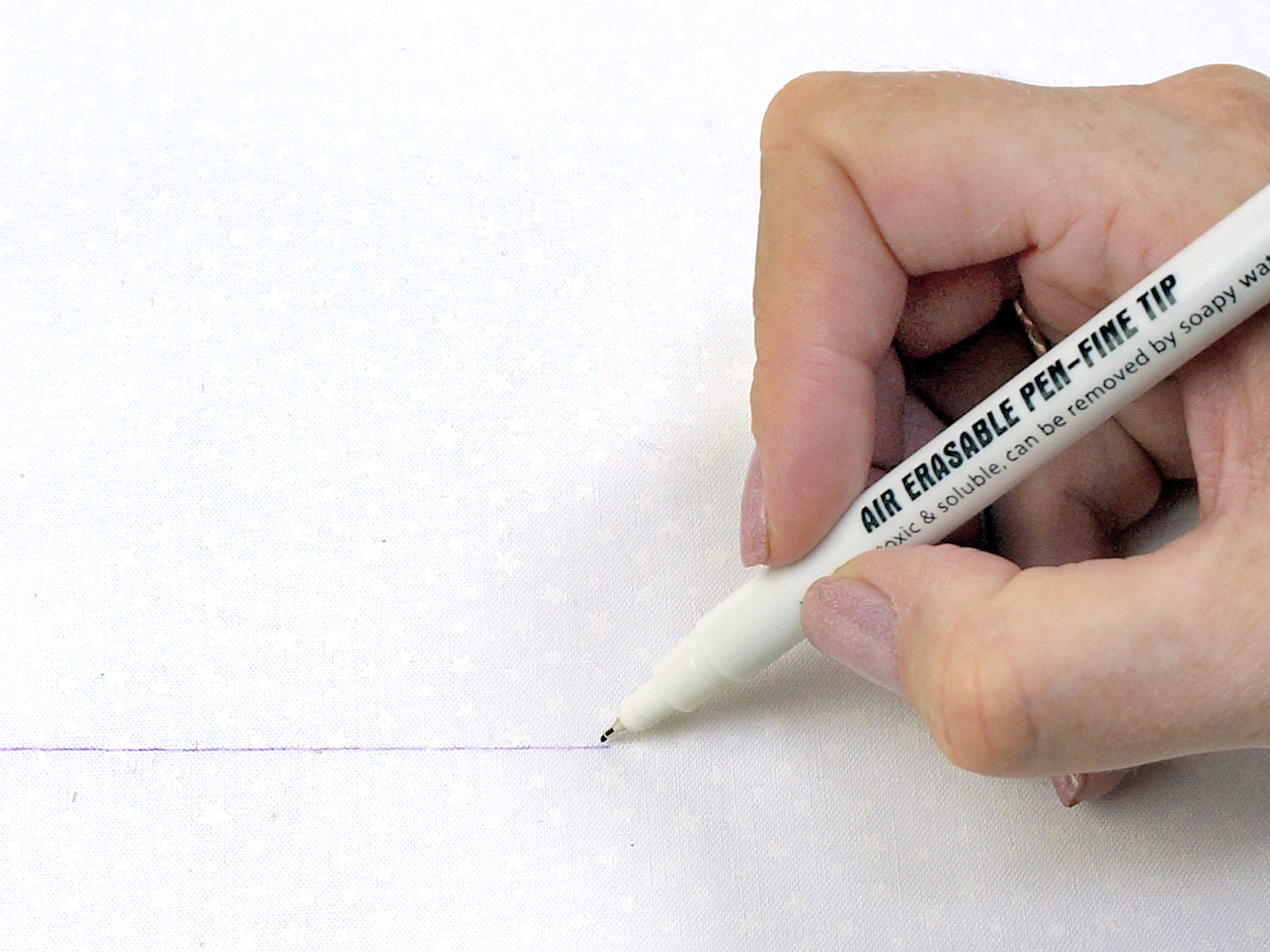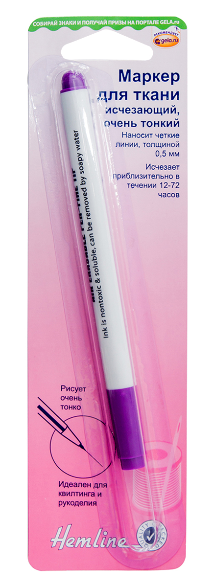 Линия маркера фиолетового цвета, толщина - 0,5 мм. Линии с ткани исчезают на воздухе в течение 24 - 72 часов. Удаление (исчезновение на воздухе) нанесенных линий на ткани зависит от типа волокна и самой ткани. Поэтому предварительно протестируйте на кусочке ткани, чтобы убедиться, что удаление вас устраивает. При необходимости линии маркера можно досрочно удалить прохладной водой.