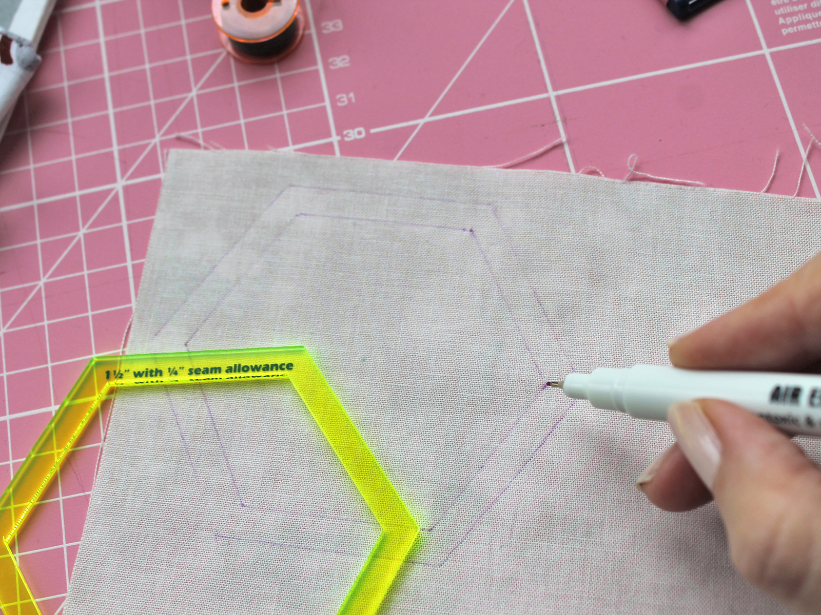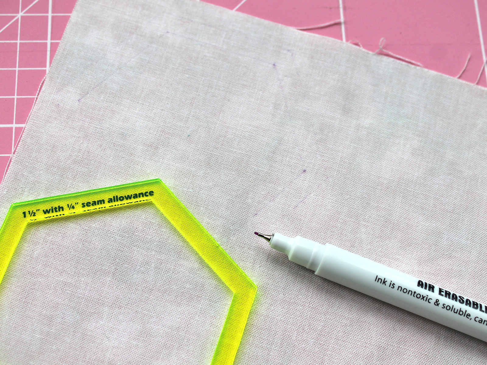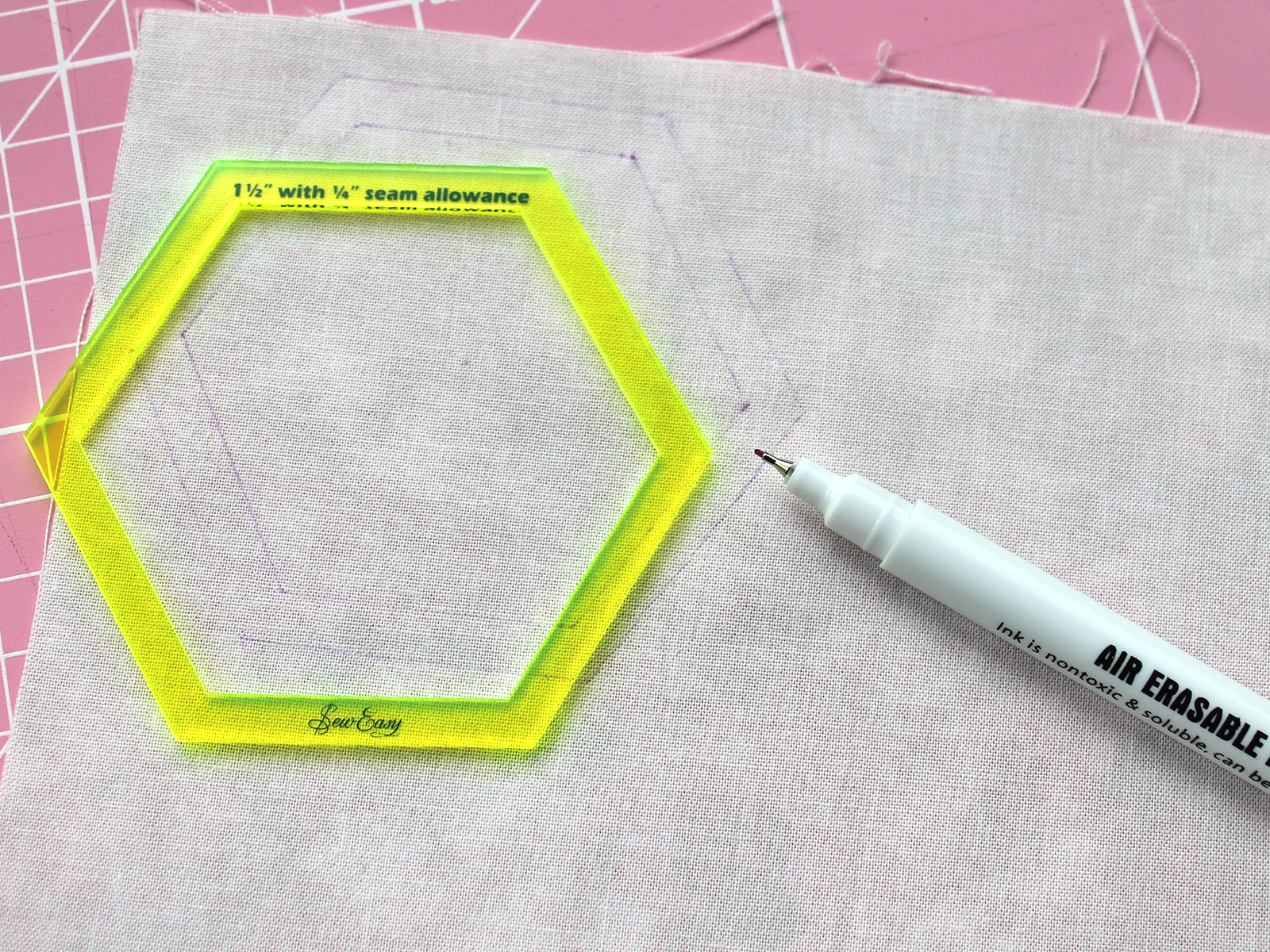 Линия маркера фиолетового цвета, толщина - 0,5 мм. Линии с ткани исчезают на воздухе в течение 24 - 72 часов. Удаление (исчезновение на воздухе) нанесенных линий на ткани зависит от типа волокна и самой ткани. Поэтому предварительно протестируйте на кусочке ткани, чтобы убедиться, что удаление вас устраивает. При необходимости линии маркера можно досрочно удалить прохладной водой.