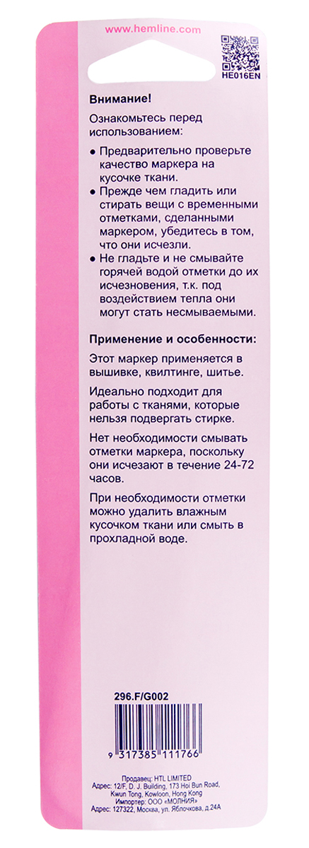 Внимание! Не смывайте маркер горячей водой и не проглаживайте ткань, пока линии видны, так как в этом случае линии маркера могут стать несмываемыми.