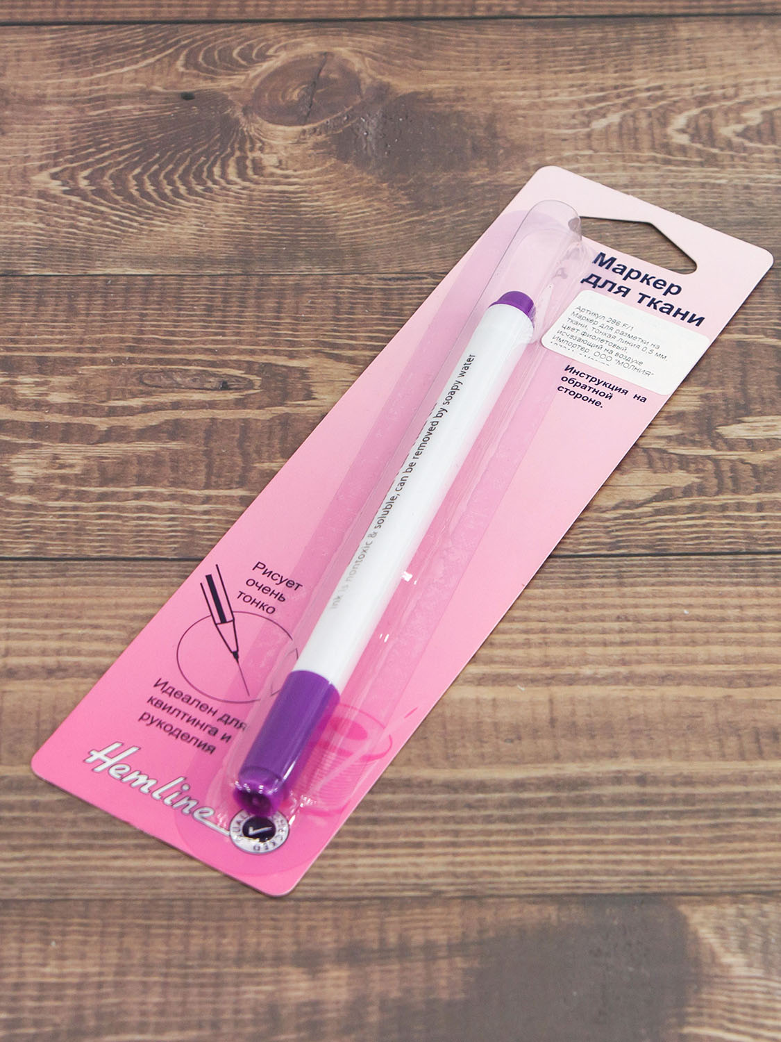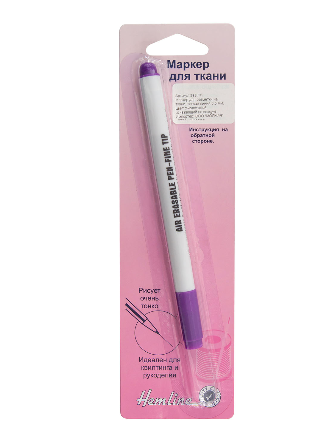 Линия маркера фиолетового цвета, толщина - 0,5 мм. Линии с ткани исчезают на воздухе в течение 24 - 72 часов. Удаление (исчезновение на воздухе) нанесенных линий на ткани зависит от типа волокна и самой ткани. Поэтому предварительно протестируйте на кусочке ткани, чтобы убедиться, что удаление вас устраивает. При необходимости линии маркера можно досрочно удалить прохладной водой.
