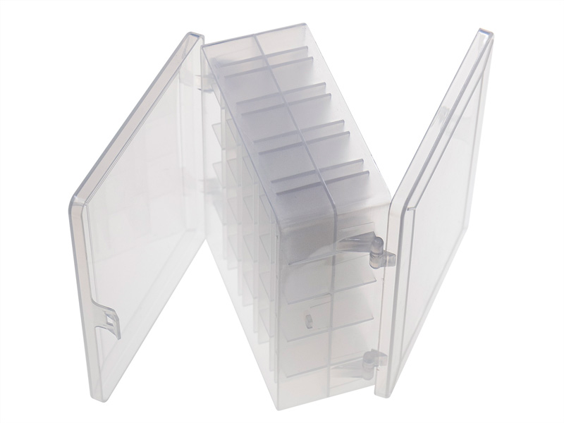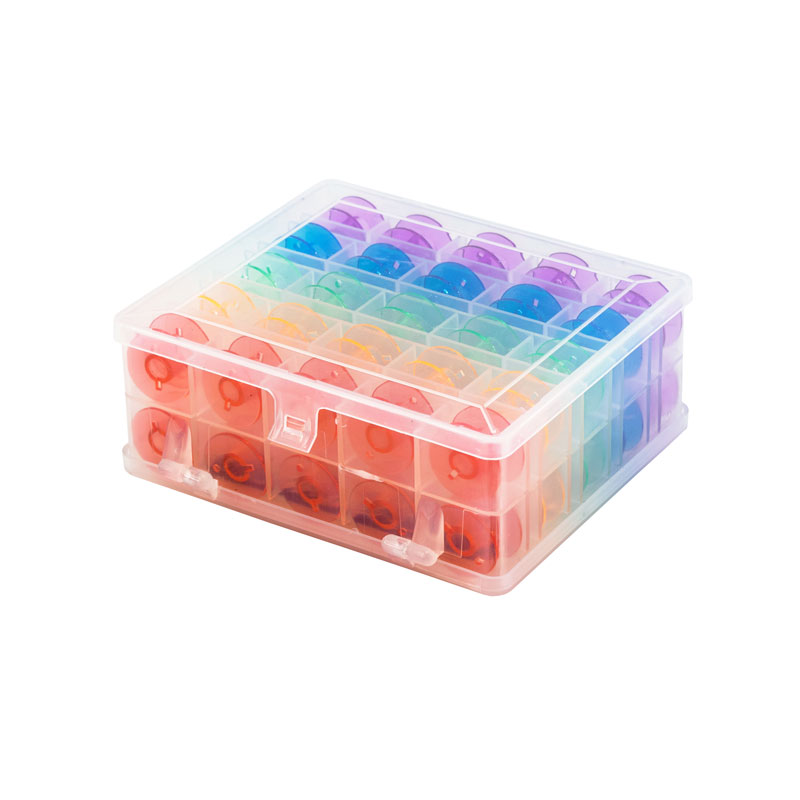 Удобный пластиковый органайзер для машинных шпулек. Наполнен 50 шпулями разных цветов. Шпули подходят большинству швейных машин (как для швейных машин марки Janome/New Home). Органайзер открывается с двух сторон для лучшего доступа к шпулям. Плотное закрытие и надёжные замки.